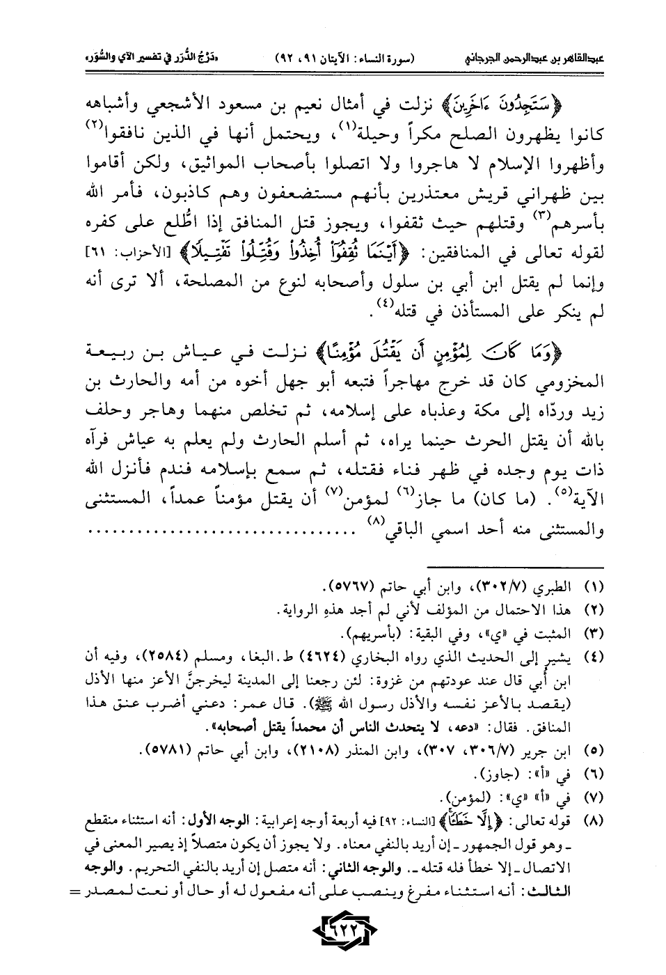 {وَمَا كَانَ لِمُؤْمِنٍ أَنْ يَقْتُلَ مُؤْمِنًا} نزلت في عياش بن ربيعة المخزومي كان قد خرج مهاجرًا فتبعه أبو جهل أخوه من أمه والحارث بن زيد وردّاه إلى مكة وعذباه على إسلامه، ثم تخلص منهما وهاجر وحلف بالله أن يقتل الحارث حينما يراه، ثم أسلم الحارث ولم يعلم به عياش فرآه ذات يوم وجده في ظهر فناء فقتله، ثم سمع بإسلامه فندم فأنزل الله الآية (¬5). (ما كان) ما جاز (¬6) لمؤمن (¬7) أن يقتل مؤمنًا عمدًا، المستثنى والمستثنى منه أحد اسمي الباقي (¬8) .................................