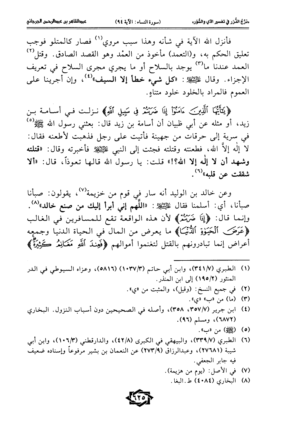 وعن خالد بن الوليد أنه سار في قوم من خزيمة (¬7)، يقولون: صبأنا صبأنا، أي: أسلمنا فقال -عليه السلام-: "اللهم إني أبرأ إليك من صنع خالد" (¬8). وإنما قال: {إِذَا ضَرَبْتُمْ} لأن هذه الواقعة تقع للمسافرين في الغالب {عَرَضَ الْحَيَاةِ الدُّنْيَا} ما يعرض من المال في الحياة الدنيا وجمعه أعراض إنما تبادرونهم بالقتل لتغنموا أموالهم {فَعِنْدَ اللَّهِ مَغَانِمُ كَثِيرَةٌ}