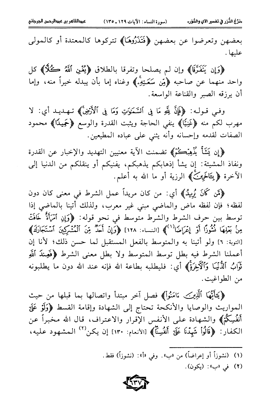 {يَا أَيُّهَا الَّذِينَ آمَنُوا} فصل آخر مبتدأ واتصالها بما قبلها من حيث المواريث والوصايا والأنكحة تحتاج إلى الشهادة وإقامة القسط {وَلَوْ عَلَى أَنْفُسِكُمْ} والشهادة على الأنفس الإقرار والاعتراف، قال الله مخبرًا عن الكفار: {قَالُوا شَهِدْنَا عَلَى أَنْفُسِنَا} [الأنعام: 130] إن يكن (¬2) المشهود عليه،