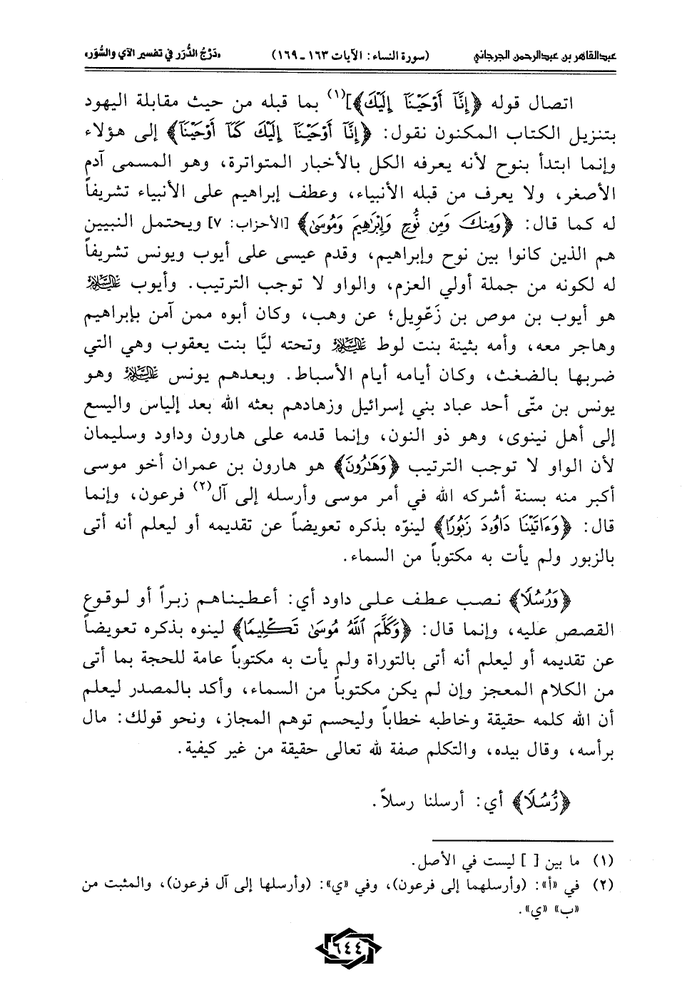 اتصال قوله {إِنَّا أَوْحَيْنَا إِلَيْكَ}] (¬1) بما قبله من حيث مقابلة اليهود بتنزيل الكتاب المكنون نقول: {إِنَّا أَوْحَيْنَا إِلَيْكَ كَمَا أَوْحَيْنَا} إلى هؤلاء وإنما ابتدأ بنوح لأنه يعرفه الكل بالأخبار المتواترة، وهو المسمى آدمٍ الأصغر، ولا يعرف من قبله الأنبياء، وعطف إبراهيم على الأنبياء تشريفًا له كما قال: {وَمِنْكَ وَمِنْ نُوحٍ وَإِبْرَاهِيمَ وَمُوسَى} [الأحزاب: 7] ويحتمل النبيين هم الذين كانوا بين نوح وإبراهيم، وقدم عيسى على أيوب ويونس تشريفًا له لكونه من جملة أولي العزم، والواو لا توجب الترتيب. وأيوب -عليه السلام- هو أيوب بن موص بن زَعّوِيل؛ عن وهب، وكان أبوه ممن آمن بإبراهيم وهاجر معه، وأمه بثينة بنت لوط -عليه السلام- وتحته ليَّا بنت يعقوب وهي التي ضربها بالضغث، وكان أيامه أيام الأسباط. وبعدهم يونس -عليه السلام- وهو يونس بن متّى أحد عباد بني إسرائيل وزهادهم بعثه الله بعد إلياس واليسع إلى أهل نينوى، وهو ذو النون، وإنما قدمه على هارون وداود وسليمان لأن الواو لا توجب الترتيب {وَهَارُونَ} هو هارون بن عمران أخو موسى أكبر منه بسنة أشركه الله في أمر موسى وأرسله إلى آل (¬2) فرعون، وإنما قال: {وَآتَيْنَا دَاوُودَ زَبُورًا} لينوّه بذكره تعويضًا عن تقديمه أو ليعلم أنه أتى بالزبور ولم يأت به مكتوبًا من السماء.