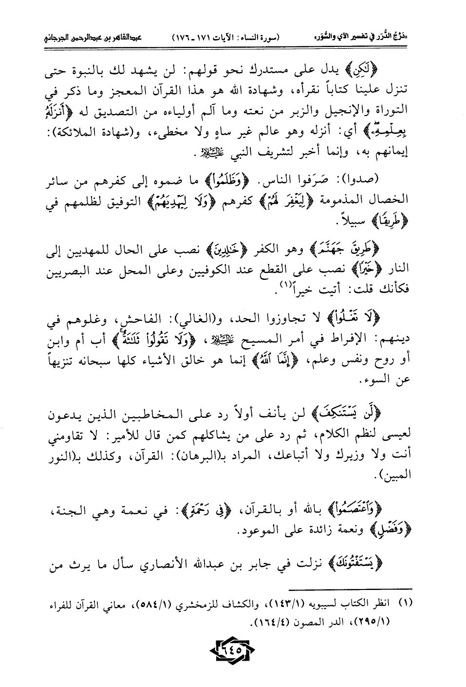 {لَّنْ يَسْتَنْكِفَ} لن يأنف أولًا رد على المخاطبين الذين يدعون لعيسى لنظم الكلام، ثم رد على من يشاكلهم كمن قال للأمير: لا تقاومني أنت ولا وزيرك ولا أتباعك، المراد بـ (البرهان): القرآن، وكذلك بـ (النور المبين).