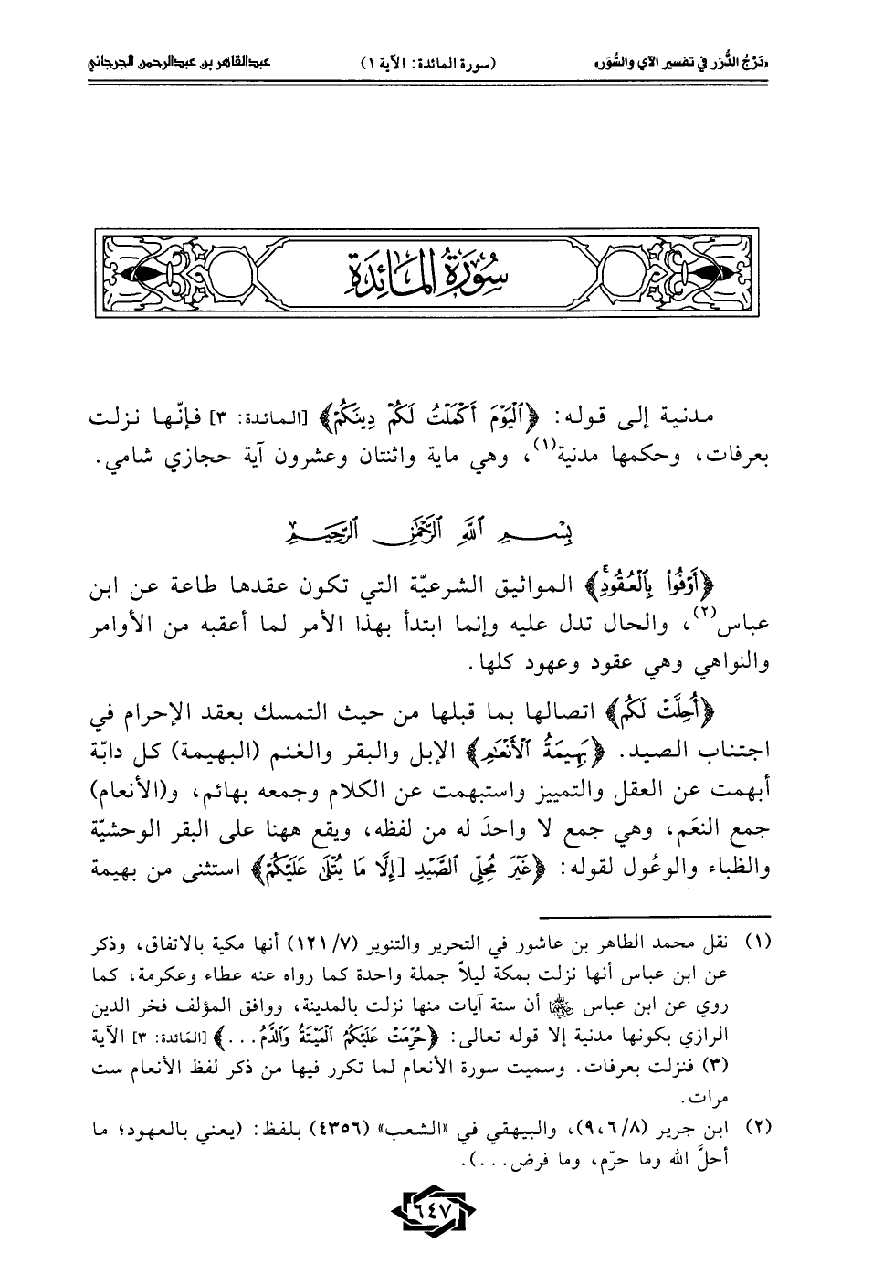 (¬1) نقل محمَّد الطاهر بن عاشور في التحرير والتنوير (7/ 121) أنها مكية بالاتفاق، وذكر عن ابن عباس أنها نزلت بمكة ليلًا جملة واحدة كما رواه عنه عطاء وعكرمة، كما روي عن ابن عباس - رضي الله عنهما - أن ستة آيات منها نزلت بالمدينة، ووافق المؤلف فخر الدين الرازي بكونها مدنية إلا قوله تعالى: {حُرِّمَتْ عَلَيْكُمُ الْمَيْتَةُ وَالدَّمُ ...} [المَائدة: 3] الآية (3) فنزلت بعرفات. وسميت سورة الأنعام لما تكرر فيها من ذكر لفظ الأنعام ست مرات.