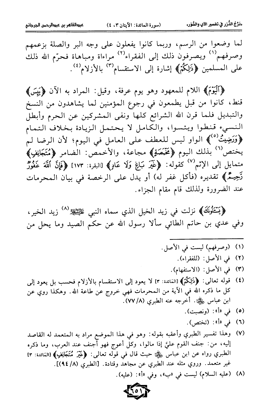 {الْيَوْمِ} اللام للمعهود وهو يوم عرفة، وقيل: المراد به الآن {يَئِسَ} قنط، كانوا من قبل يطمعون في رجوع المؤمنين لما يشاهدون من النسخ والتبديل فلما قرن الله الشرائع كلها ونفى المشركين عن الحرم وأبطل النسيء قنطوا ويئسوا، والكامل لا يحتمل الزيادة بخلاف التمام {وَرَضِيتُ (¬5)} الواو ليس للعطف على العامل في اليوم؛ لأن الرضا لم يختص (¬6) بذلك اليوم {مَخْمَصَةٍ} مجاعة، والأخمص: الضامر {مُتَجَانِفٍ} متمايل إلى الإثم (¬7) كقوله: {غَيْرَ بَاغٍ وَلَا عَادٍ} [البقرة: 173] {فَإِنَّ اللَّهَ غَفُورٌ رَحِيمٌ} تقديره (فأكل غفر له) أو يدل على الرخصة في بيان المحرمات عند الضرورة ولذلك قام مقام الجزاء.