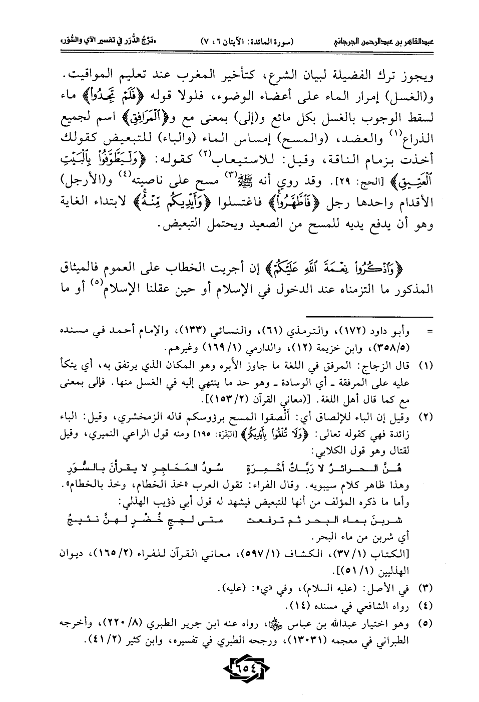 ويجوز ترك الفضيلة لبيان الشرع، كتأخير المغرب عند تعليم المواقيت. و (الغسل) إمرار الماء على أعضاء الوضوء، فلولا قوله {فَلَمْ تَجِدُوا} ماء لسقط الوجوب بالغسل بكل مائع و (إلى) بمعنى مع و {الْمَرَافِقِ} اسم لجميع الذراع (¬1) والعضد، (والمسح) إمساس الماء (والباء) للتبعيض كقولك أخذت بزمام الناقة، وقيل: للاستيعاب (¬2) كقوله: {وَلْيَطَوَّفُواْ بِاَلبيتِ العَتِيقِ} [لحج: 29]. وقد روي أنه - صلى الله عليه وسلم - (¬3) مسح على ناصيته (¬4) و (الأرجل) الأقدام واحدها رجل {فَاطَّهَّرُوا} فاغتسلوا {وَأَيْدِيكُمْ مِنْهُ} لابتداء الغاية وهو أن يدفع يديه للمسح من الصعيد ويحتمل التبعيض.