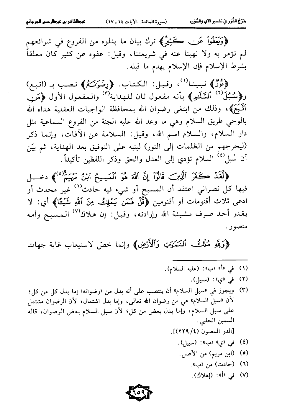 {نُورٌ} نبينا (¬1)، وقيل: الكتاب. {رِضْوَانَهُ} نصب بـ (اتبع) و {سُبُلَ (¬2) السَّلَامِ} بأنه مفعول ثان للهداية (¬3) والمفعول الأول {مَنِ اتَّبَعَ}، وذلك من ابتغى رضوان الله بمحافظة الواجبات العقلية هداه الله بالوحي طريق السلام وهي ما وعد الله عليه الجنة من الفروع السماعية مثل دار السلام، والسلام اسم الله، وقيل: السلامة عن الآفات، وإنما ذكر (ليخرجهم من الظلمات إلى النور) لينبه على التوفيق بعد الهداية، ثم بيّن أن سُبل (¬4) السلام تؤدي إلى العدل والحق وذكر اللفظين تأكيدًا.