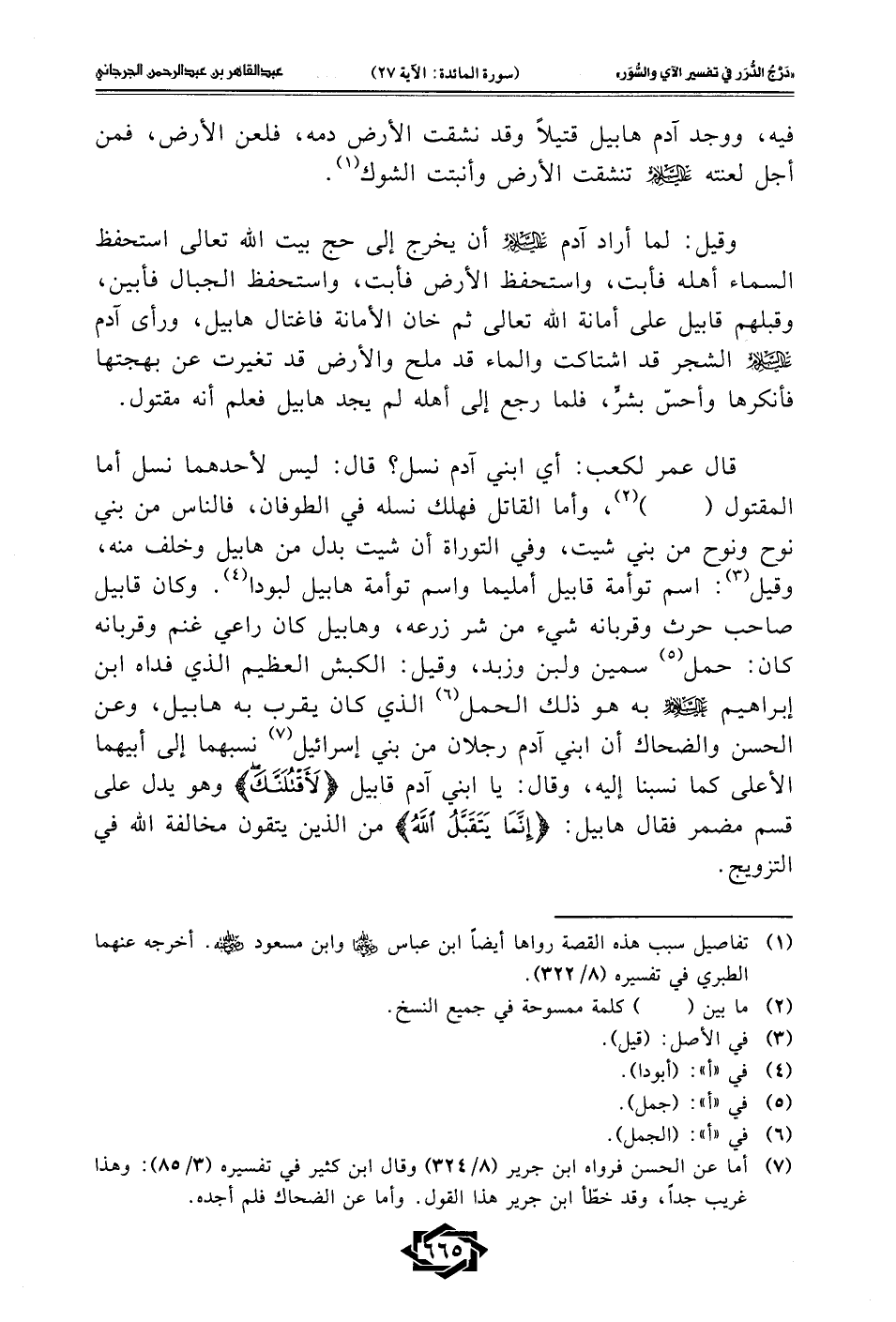 قال عمر لكعب: أي ابني آدم نسل؟ قال: ليس لأحدهما نسل أما المقتول (...) (¬2)، وأما القاتل فهلك نسله في الطوفان، فالناس من بني نوح ونوح من بني شيت، وفي التوراة أن شيت بدل من هابيل وخلف منه، وقيل (¬3): اسم توأمة قابيل أمليما واسم توأمة هابيل لبودا (¬4). وكان قابيل صاحب حرث وقربانه شيء من شر زرعه، وهابيل كان راعي غنم وقربانه كان: حمل (¬5) سمين ولبن وزبد، وقيل: الكبش العظيم الذي فداه ابن إبراهيم -عليه السلام- به هو ذلك الحمل (¬6) الذي كان يقرب به هابيل، وعن الحسن والضحاك أن ابني آدم رجلان من بني إسرائيل (¬7) نسبهما إلى أبيهما الأعلى كما نسبنا إليه، وقال: يا ابني آدم قابيل {لَأَقْتُلَنَّكَ} وهو يدل على قسم مضمر فقال هابيل: {إِنَّمَا يَتَقَبَّلُ اللَّهُ} من الذين يتقون مخالفة الله في التزويج.