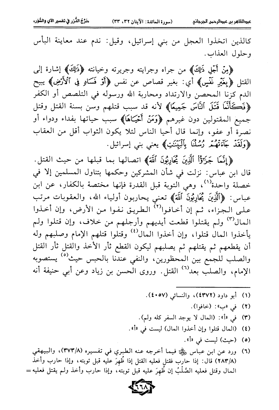 {إِنَّمَا جَزَاءُ الَّذِينَ يُحَارِبُونَ اللَّهَ} اتصالها بما قبلها من حيث القتل. قال ابن عباس: نزلت في شأن المشركين وحكمها بتناول المسلمين إلا في خصلة واحدة (¬1)، وهي التوبة قبل القدرة فإنها مختصة بالكفار، عن ابن عباس: {الَّذِينَ يُحَارِبُونَ اللَّهَ} تعني يحاربون أولياء الله، والعقوبات مرتب على الجزاء، ثم إن أخافوا (¬2) الطريق نفوا من الأرض، وإن أخذوا المال (¬3) ولم يقتلوا قطعت أيديهم وأرجلهم من خلاف، وإن قتلوا ولم يأخذوا المال قتلوا، وإن أخذوا المال (¬4) وقتلوا قتلهم الإمام وصلبهم وله أن يقطعهم ثم يقتلهم ثم يصلبهم ليكون القطع ثأر الأخذ والقتل ثأر القتل والصلب للجمع بين المحظورين، والنفي عندنا بالحبس حيث (¬5) يستصوبه الإمام، والصلب بعد (¬6) القتل. وروى الحسن بن زياد وعن أبي حنيفة أنه
