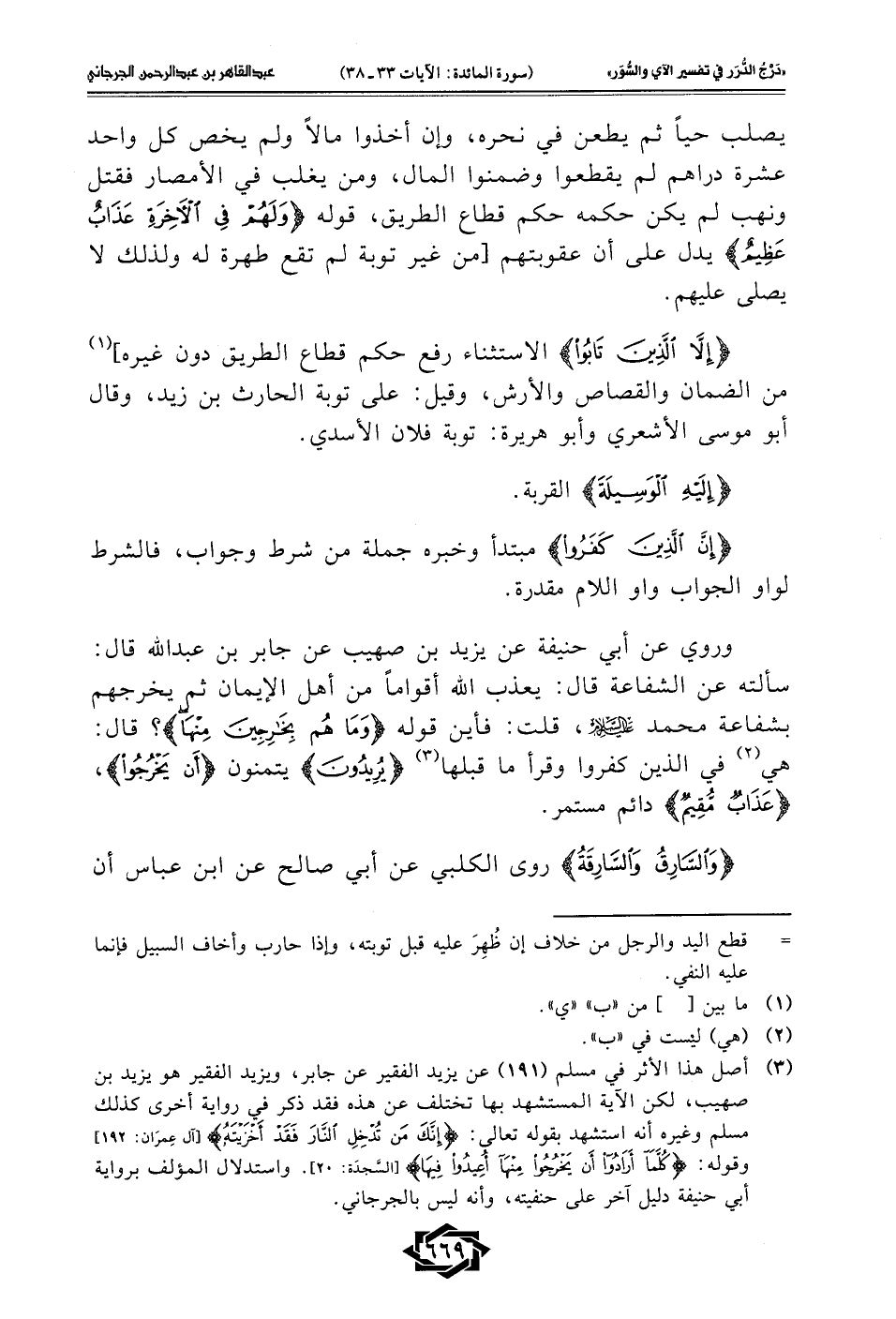 (¬3) أصل هذا الأثر في مسلم (191) عن يزيد الفقير عن جابر، ويزيد الفقير هو يزيد بن صهيب، لكن الآية المستشهد بها تختلف عن هذه فقد ذكر فيِ رواية أخرى كذلك مسلم وغيره أنه استشهد بقوله تعالى: {إِنَّكَ مَنْ تُدْخِلِ النَّارَ فَقَدْ أَخْزَيْتَهُ} [آل عِمرَان: 192] وقوله: {كُلَّمَا أَرَادُوا أَنْ يَخْرُجُوا مِنْهَا أُعِيدُوا فِيهَا} [السجدة: 20]. واستدلال المؤلف برواية أبي حنيفة دليل آخر على حنفيته، وأنه ليس بالجرجاني.