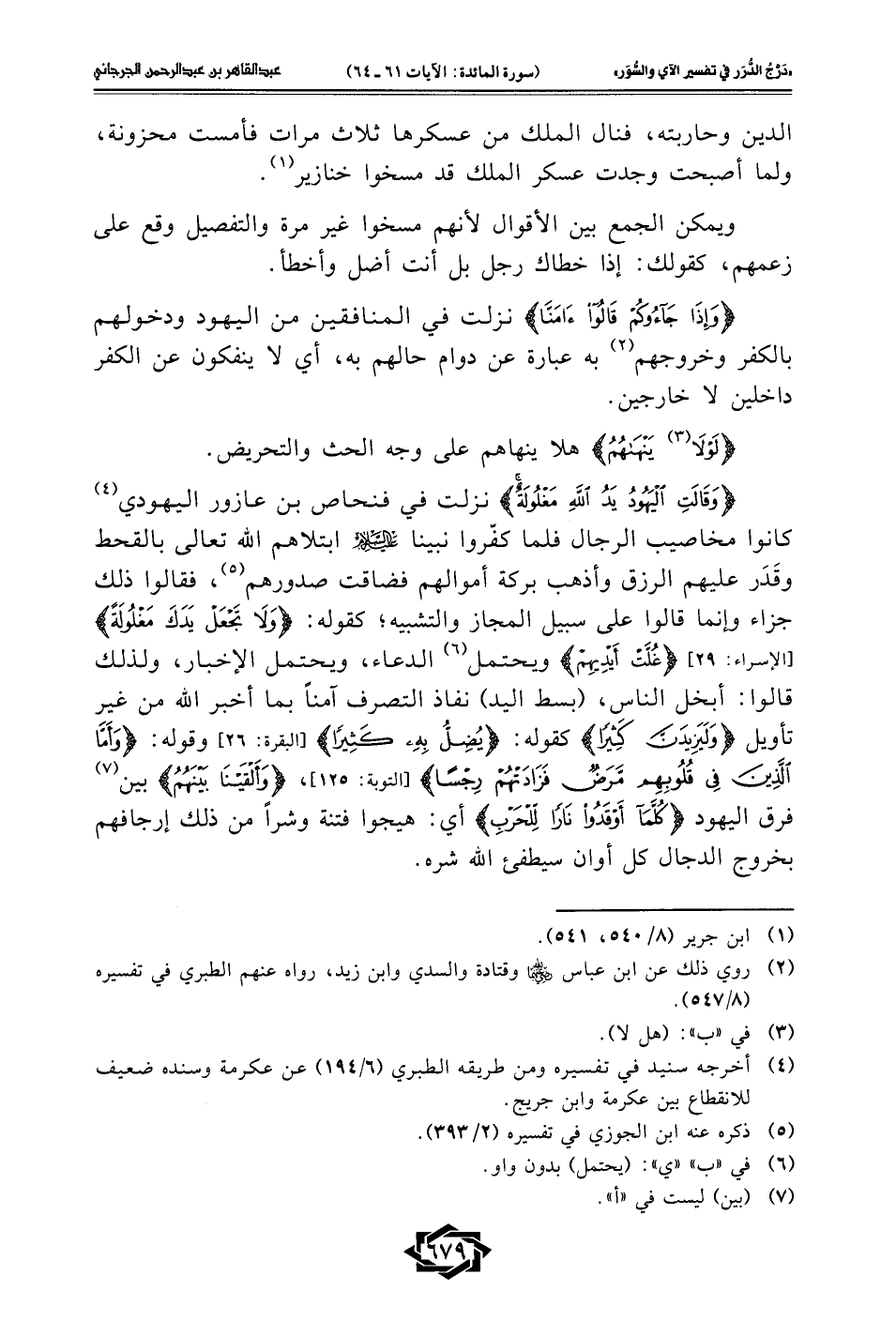 {وَقَالَتِ الْيَهُودُ يَدُ اللَّهِ مَغْلُولَةٌ} نزلت في فنحاص بن عازور اليهودي (¬4) كانوا مخاصيب الرجال فلما كفّروا نبينا -عليه السلام- ابتلاهم الله تعالى بالقحط وقَدَر عليهم الرزق وأذهب بركة أموالهم فضاقت صدورهم (¬5)، فقالوا ذلك جزاء وإنما قالوا على سبيل المجاز والتشبيه؛ كقوله: {وَلَا تَجْعَلْ يَدَكَ مَغْلُولَةً} [الإسراء: 29] {غُلَّتْ أَيْدِيهِمْ} ويحتمل (¬6) الدعاء، ويحتمل الإخبار، ولذلك قالوا: أبخل الناس، (بسط اليد) نفاذ التصرف آمنًا بما أخبر الله من غير تأويل {وَلَيَزِيدَنَّ كَثِيرًا} كقوله: {يُضِلُّ بِهِ كَثِيرًا} [لبقرة: 26] وقوله: {وَأَمَّا الَّذِينَ فِي قُلُوبِهِمْ مَرَضٌ فَزَادَتْهُمْ رِجْسًا} [التوبة: 125]، {وَأَلْقَيْنَا بَيْنَهُمُ} بين (¬7) فرق اليهود {كُلَّمَا أَوْقَدُوا نَارًا لِلْحَرْبِ} أي: هيجوا فتنة وشرًا من ذلك إرجافهم بخروج الدجال كل أوان سيطفئ الله شره.