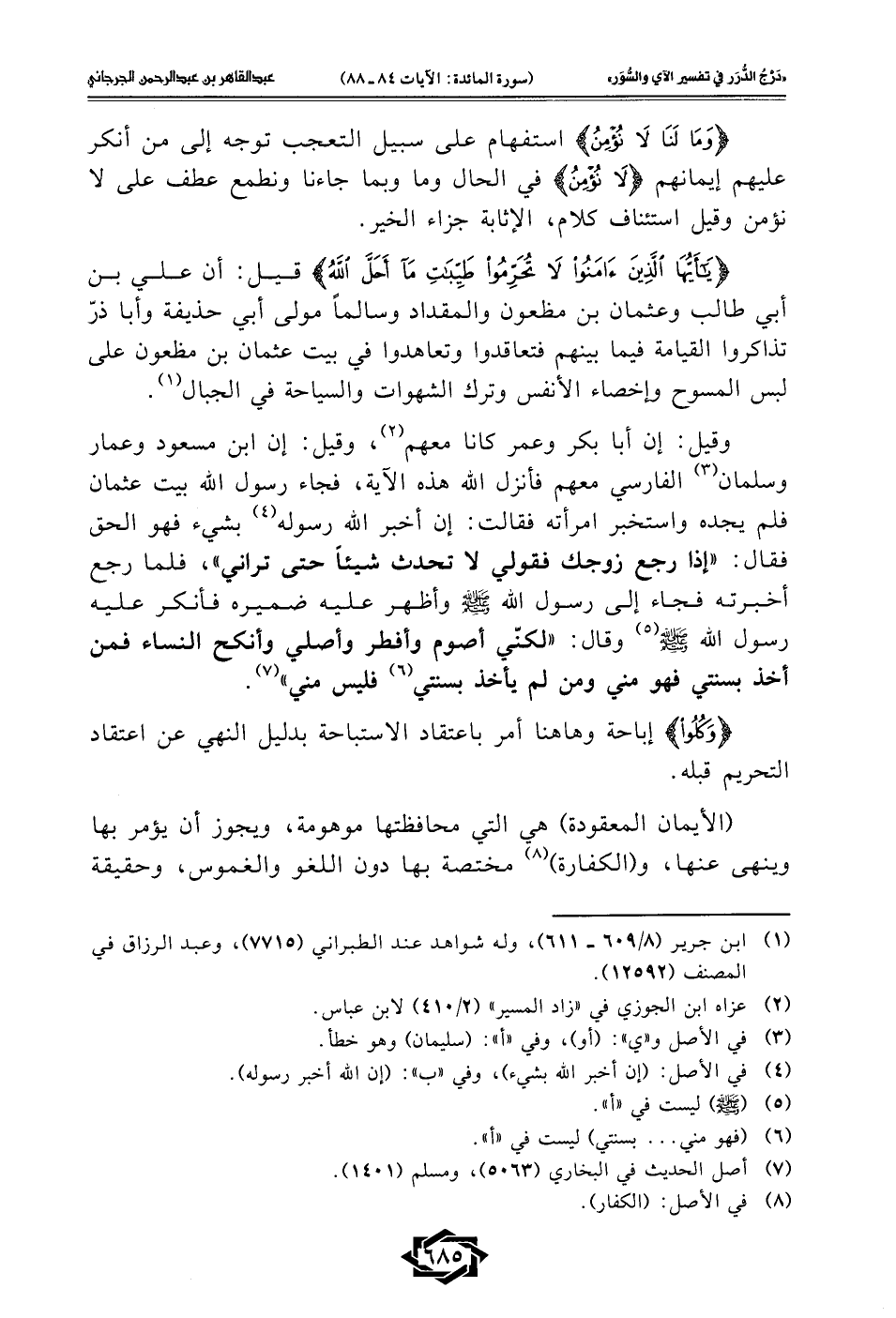 وقيل: إن أبا بكر وعمر كانا معهم (¬2)، وقيل: إن ابن مسعود وعمار وسلمان (¬3) الفارسي معهم فأنزل الله هذه الآية، فجاء رسول الله بيت عثمان فلم يجده واستخبر امرأته فقالت: إن أخبر الله رسوله (¬4) بشىء فهو الحق فقال: "إذا رجع زوجك فقولي لا تحدث شيئًا حتى تراني"، فلما رجع أخبرته فجاء إلى رسول الله - صلى الله عليه وسلم - وأظهر عليه ضميره فأنكر عليه رسول الله - صلى الله عليه وسلم - (¬5) وقال: "لكنّي أصوم وأفطر وأصلي وأنكح النساء فمن أخذ بسنتي فهو مني ومن لم يأخذ بسنتي (¬6) فليس مني" (¬7).
