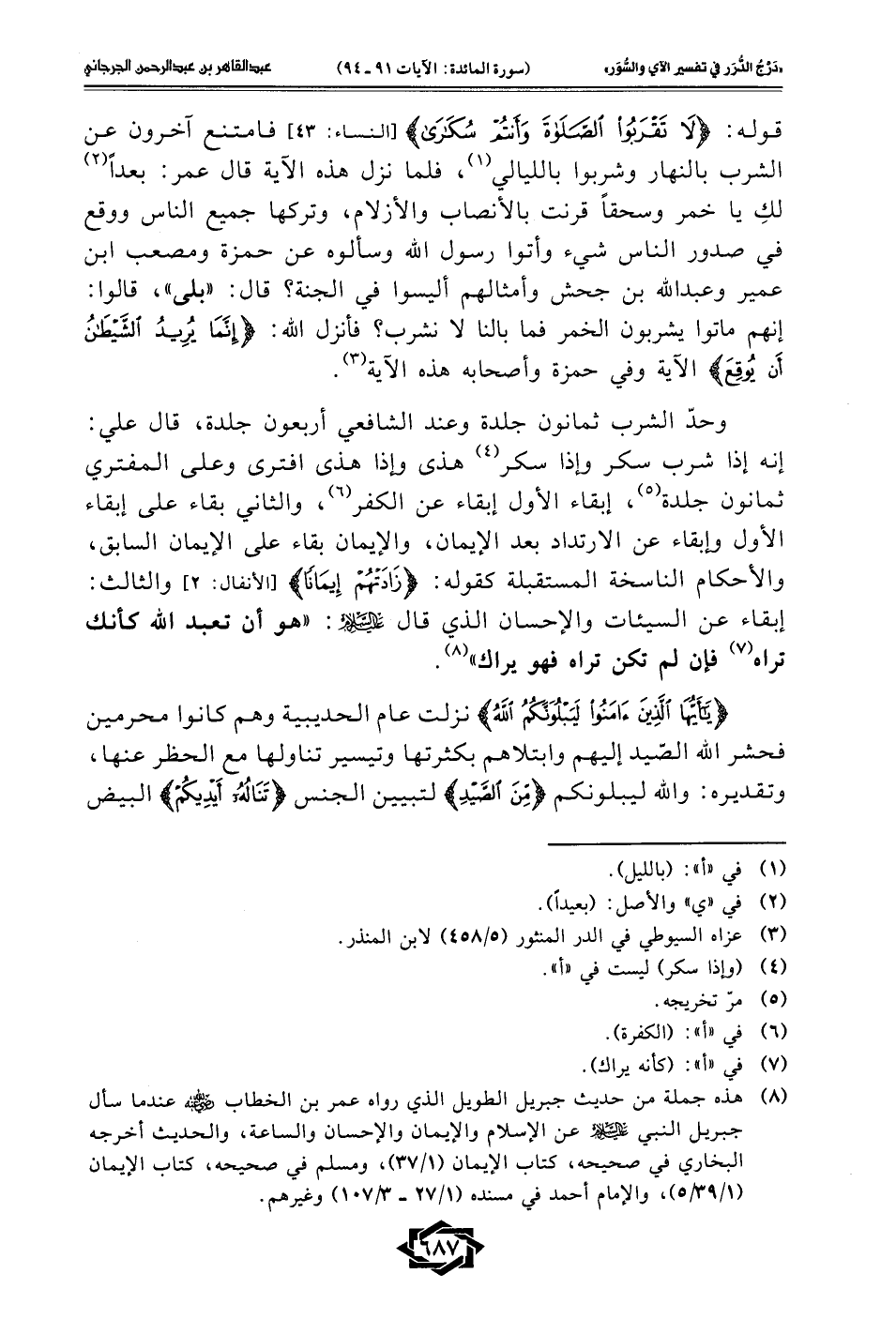 وحدّ الشرب ثمانون جلدة وعند الشافعي أربعون جلدة، قال علي: إنه إذا شرب سكر وإذا سكر (¬4) هذى وإذا هذى افترى وعلى المفتري ثمانون جلدة (¬5)، إبقاء الأول إبقاء عن الكفر (¬6)، والثاني بقاء على إبقاء الأول وإبقاء عن الارتداد بعد الإيمان، والإيمان بقاء على الإيمان السابق، والأحكام الناسخة المستقبلة كقوله: {زَادَتهُم إِيمَانًا} [الأنفال: 2] والثالث: إبقاء عن السيئات والإحسان الذي قال -عليه السلام-: "هو أن تعبد الله كأنك تراه (¬7) فإن لم تكن تراه فهو يراك" (¬8).
