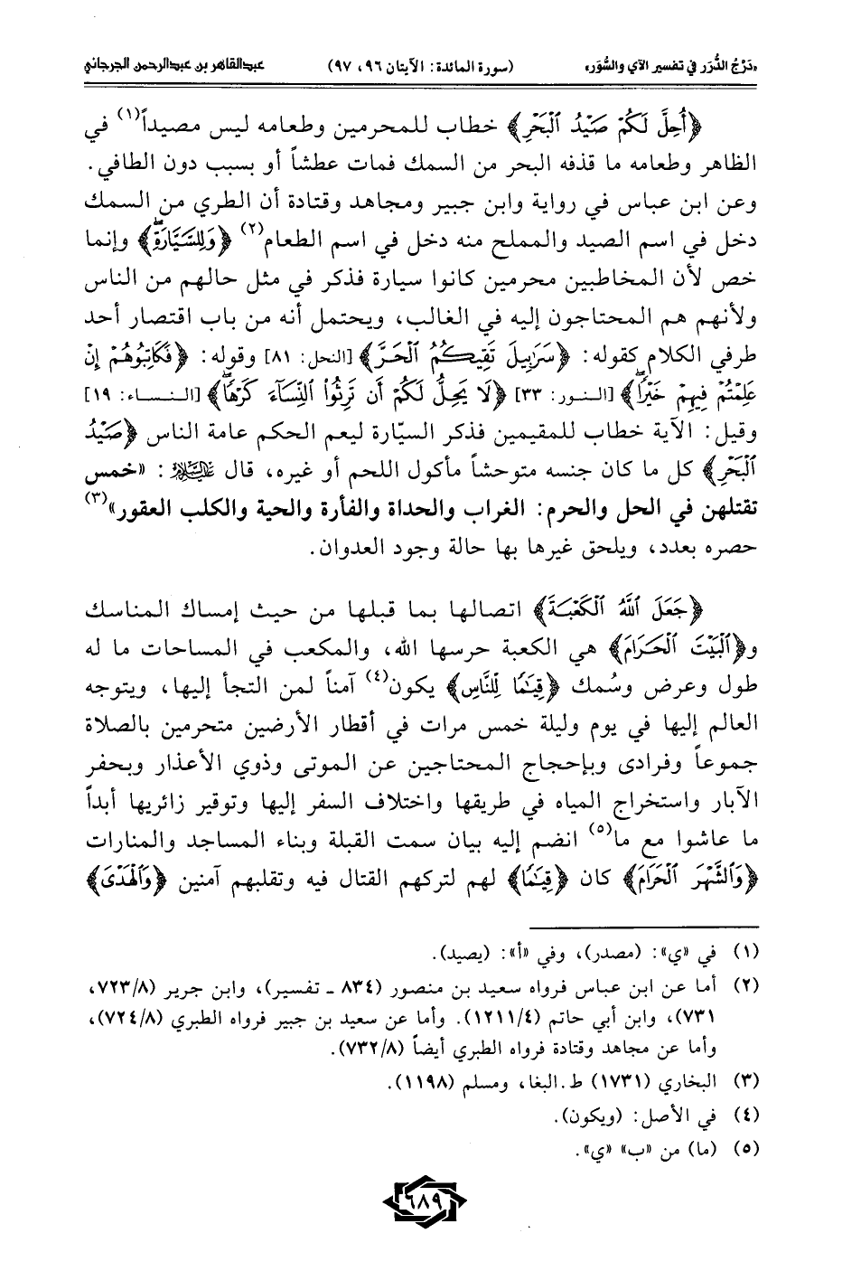 {أُحِلَّ لَكُمْ صَيْدُ الْبَحْرِ} خطاب للمحرمين وطعامه ليس مصيدًا (¬1) في الظاهر وطعامه ما قذفه البحر من السمك فمات عطشًا أو بسبب دون الطافي. وعن ابن عباس في رواية وابن جبير ومجاهد وقتادة أن الطري من السمك دخل في اسم الصيد والمملح منه دخل في اسم الطعام (¬2) {وَلِلسَّيَّارَةِ} وإنما خص لأن المخاطبين محرمين كانوا سيارة فذكر في مثل حالهم من الناس ولأنهم هم المحتاجون إليه في الغالب، ويحتمل أنه من باب اقتصار أحد طرفي الكلام كقوله: {سَرَابِيلَ تَقِيكُمُ الْحَرَّ} [النحل: 81] وقوله: {فَكَاتِبُوهُمْ إِنْ عَلِمْتُمْ فِيهِمْ خَيْرًا} [النور: 33]، {لَا يَحِلُّ لَكُمْ أَنْ تَرِثُوا النِّسَاءَ كَرْهًا} [النساء: 19] وقيل: الآية خطاب للمقيمين فذكر السيّارة ليعم الحكم عامة الناس {صَيْدُ الْبَحْرِ} كل ما كان جنسه متوحشًا مأكول اللحم أو غيره، قال -عليه السلام-: "خمس تقتلهن في الحل والحرم: الغراب والحداة والفأرة والحية والكلب العقور" (¬3) حصره بعدد، ويلحق غيرها بها حالة وجود العدوان.