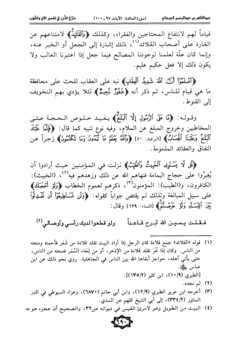 (¬1) قوله "القلائد" جمع قلادة كان الرجل إذا أراد البيت تقلد قلادة من شَعَر فأحمته ومنعته من الناس. وكان إذا نَفَرَ تقلد قلادة من الإذخر، أو من لِحَاء السَّمَر فمنعته من الناس، حتى يأتي أهله، حواجز أبقاها الله بين الناس في الجاهلية. روي نحو ذلك عن ابن عباس - رضي الله عنهما -.