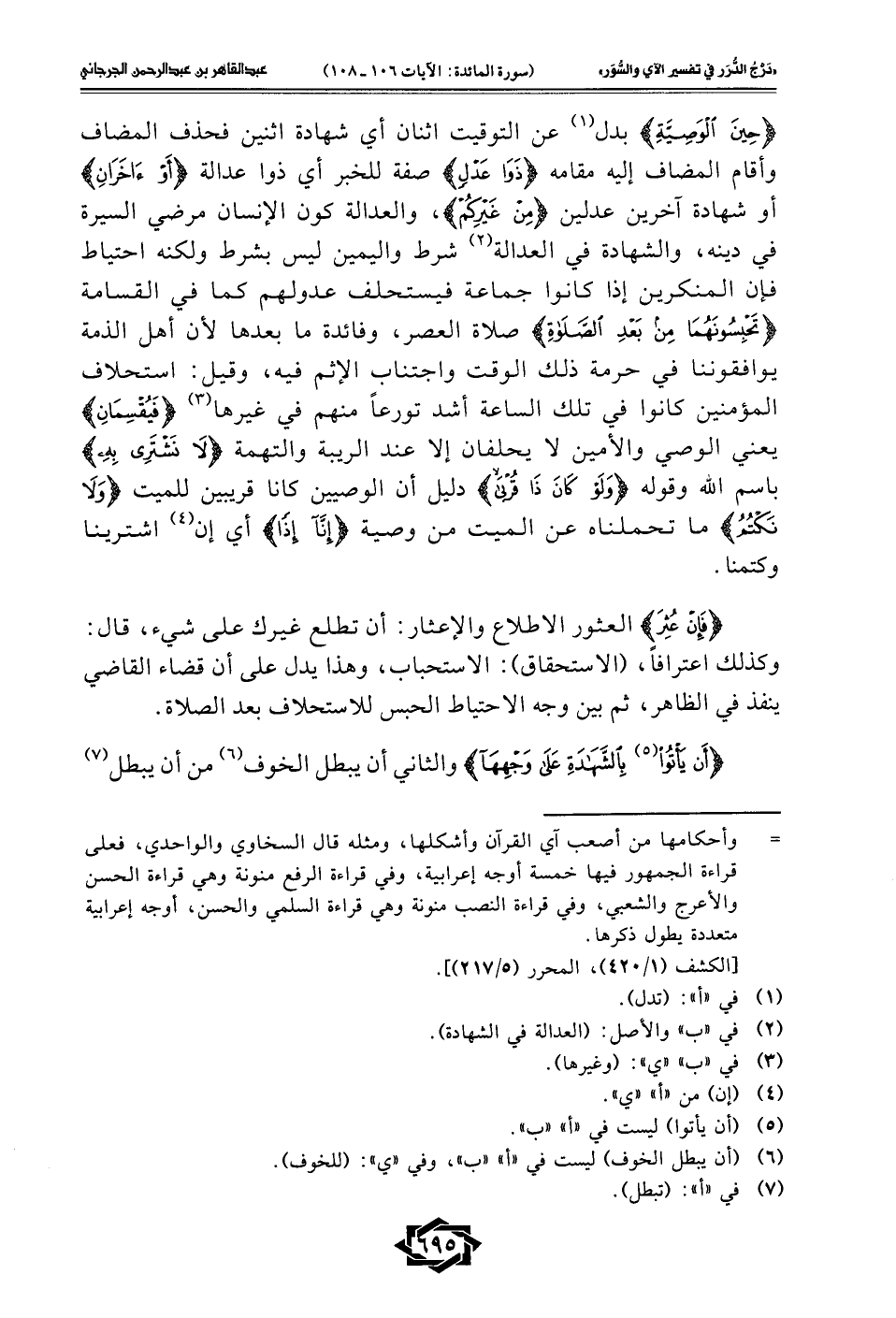 {حِينَ الْوَصِيَّةِ} بدل (¬1) عن التوقيت اثنان أي شهادة اثنين فحذف المضاف وأقام المضاف إليه مقامه {ذَوَا عَدْلٍ} صفة للخبر أي ذوا عدالة {أَوْ آخَرَانِ} أو شهادة آخرين عدلين {مِنْ غَيْرِكُمْ}، والعدالة كون الإنسان مرضي السيرة في دينه، والشهادة في العدالة (¬2) شرط واليمين ليس بشرط ولكنه احتياط فإن المنكرين إذا كانوا جماعة فيستحلف عدولهم كما في القسامة {تَحْبِسُونَهُمَا مِنْ بَعْدِ الصَّلَاةِ} صلاة العصر، وفائدة ما بعدها لأن أهل الذمة يوافقدننا في حرمة ذلك الوقت واجتناب الإثم فيه، وقيل: استحلاف المؤمنين كانوا في تلك الساعة أشد تورعًا منهم في غيرها (¬3) {فَيُقْسِمَانِ} يعني الوصي والأمين لا يحلفان إلا عند الريبة والتهمة {لَا نَشْتَرِي بِهِ} باسم الله وقوله {وَلَوْ كَانَ ذَا قُرْبَى} دليل أن الوصيين كانا قريبين للميت {وَلَا نَكْتُمُ} ما تحملناه عن الميت من وصية {إِنَّا إِذًا} أي إن (¬4) اشترينا وكتمنا.