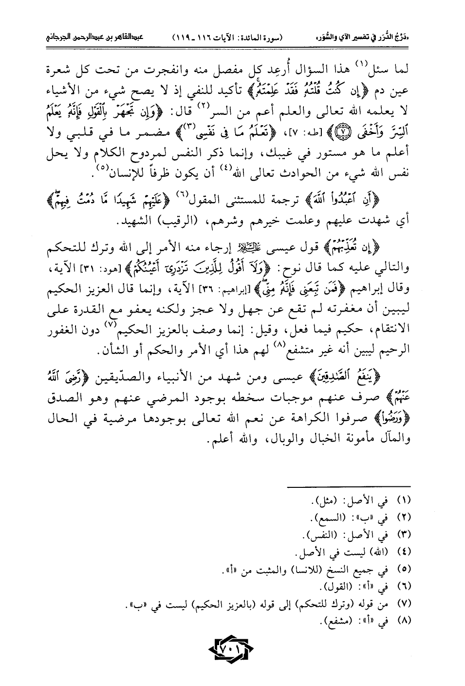 لما سئل (¬1) هذا السؤال أُرعِد كل مفصل منه وانفجرت من تحت كل شعرة عين دم {إِنْ كُنْتُ قُلْتُهُ فَقَدْ عَلِمْتَهُ} تأكيد للنفي إذ لا يصح شيء من الأشياء لا يعلمه الله تعالى والعلم أعم من السر (¬2) قال: {وَإِنْ تَجْهَرْ بِالْقَوْلِ فَإِنَّهُ يَعْلَمُ السِّرَّ وَأَخْفَى (7)} [طه: 7]، {تَعْلَمُ مَا فِي نَفْسِي (¬3)} مضمر ما في قلبي ولا أعلم ما هو مستور في غيبك، وإنما ذكر النفس لمردوح الكلام ولا يحل نفس الله شيء من الحوادث تعالى الله (¬4) أن يكون ظرفًا للإنسان (¬5).
