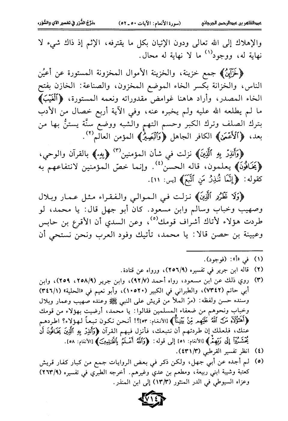 (¬3) روي ذلك عن ابن مسعود، رواه أحمد (7/ 92)، وابن جرير (9/ 258، 259)، وابن أبي حاتم (7342)، والطبراني في الكبير (10520)، وأبو نعيم في "الحلية" (1/ 346) وسنده حسن ولفظه: (مرّ الملأ من قريش على النبي - صلى الله عليه وسلم - وعنده صهيب وعمار وبلال وخباب ونحوهم من ضعفاء المسلمين فقالوا: يا محمد، أرضيت بهؤلاء من قومك {أَهَؤُلَاءِ مَنَّ اللَّهُ عَلَيْهِمْ مِنْ بَيْنِنَا} [الأنعَام: 53]؟! أنحن نكون تبعًا لهؤلاء؟ اطردهم عنك، فلعلك إن طردتهم أن نتبعك، فأنزل فيهم القرآن {وَأَنْذِرْ بِهِ الَّذِينَ يَخَافُونَ أَنْ يُحْشَرُوا إِلَى رَبِّهِمْ} [الأنعَام: 51] إلى قوله: {وَاللَّهُ أَعْلَمُ بِالظَّالِمِينَ} [الأنعَام: 58].