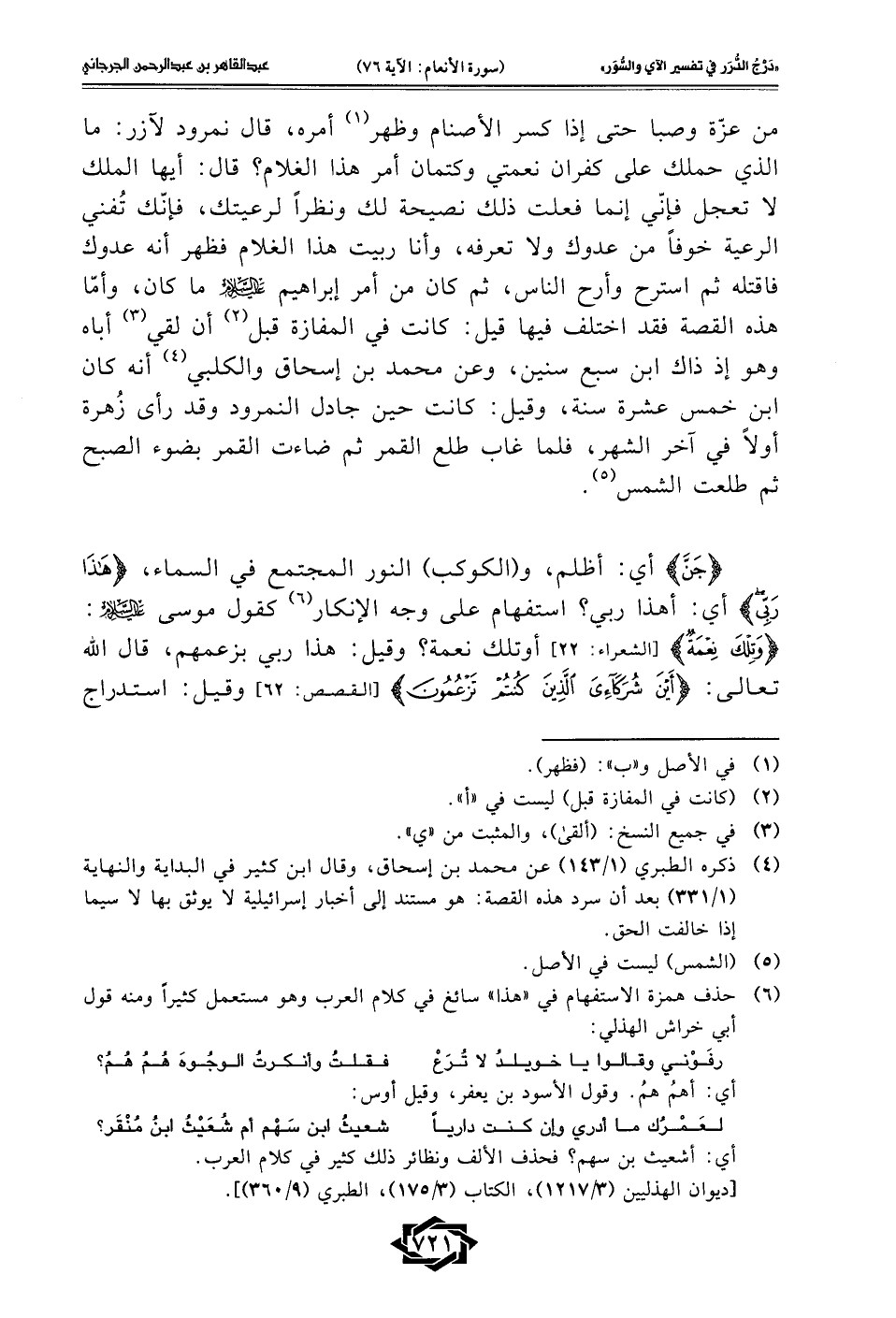 {جَنَّ} أي: أظلم، و (الكوكب) النور المجتمع في السماء، {هَذَا رَبِّي} أي: أهذا ربي؟ استفهام على وجه الإنكار (¬6) كقول موسى -عليه السلام-: {وَتِلْكَ نِعْمَةٌ} [الشعراء: 22] أو تلك نعمة؟ وقيل: هذا ربي بزعمهم، قال الله تعالى: {أَيْنَ شُرَكَائِيَ الَّذِينَ كُنْتُمْ تَزْعُمُونَ} [القصص: 62] وقيل: استدراج