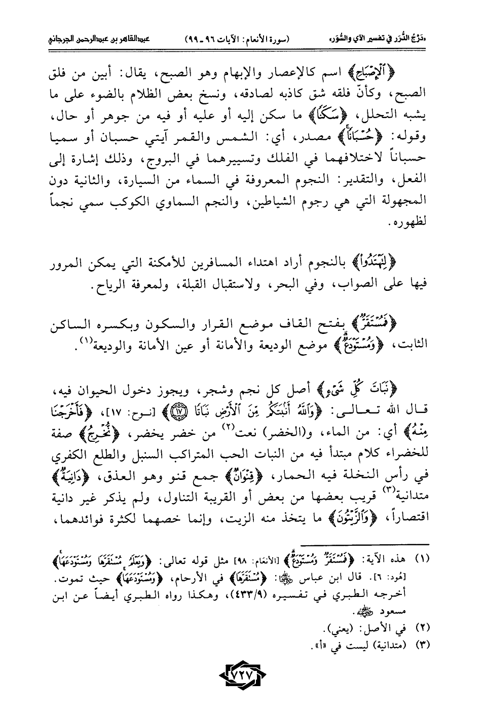 {نَبَاتَ كُلِّ شَيْءٍ} أصل كل نجم وشجر، ويجوز دخول الحيوان فيه، قال الله تعالى: {وَاللَّهُ أَنْبَتَكُمْ مِنَ الْأَرْضِ نَبَاتًا (17)} [نوح: 17]، {فَأَخْرَجْنَا مِنْهُ} أي: من الماء، و (الخضر) نعت (¬2) من خضر يخضر، {نُخْرِجُ} صفة للخضراء كلام مبتدأ فيه من النبات الحب المتراكب السنبل والطلع الكفري في رأس النخلة فيه الحمار، {قِنْوَانٌ} جمع قنو وهو العذق، {دَانِيَةٌ} متدانية (¬3) قريب بعضها من بعض أو القريبة التناول، ولم يذكر غير دانية اقتصارًا، {وَالزَّيْتُونَ} ما يتخذ منه الزيت، وإنما خصهما لكثرة فوائدهما،