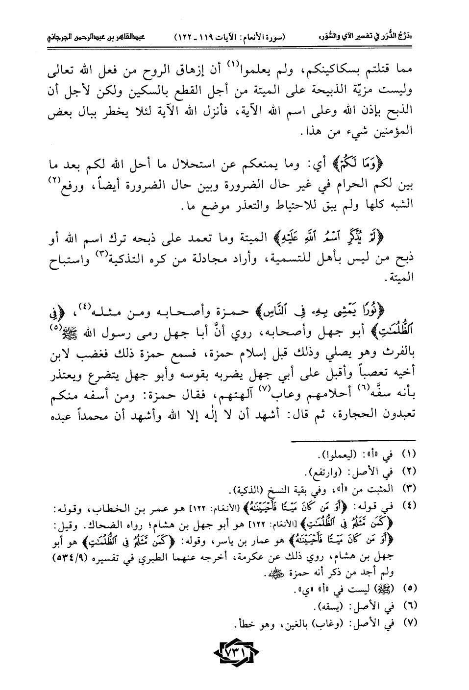 (¬4) في قوله: {أَوَمَنْ كَانَ مَيْتًا فَأَحْيَيْنَاهُ} [الأنعَام: 122] هو عمر بن الخطاب، وقوله: {كَمَنْ مَثَلُهُ فِي الظُّلُمَاتِ} [الأنعَام: 122] هو أبو جهل بن هشام؛ رواه الضحاك. وقيل: {أَوَمَنْ كَانَ مَيْتًا فَأَحْيَيْنَاهُ} هو عمار بن ياسر، وقوله: {كَمَنْ مَثَلُهُ فِي الظُّلُمَاتِ} هو أبو جهل بن هشام، روي ذلك عن عكرمة، أخرجه عنهما الطبري في تفسيره (9/ 534) ولم أجد من ذكر أنه حمزة -رضي الله عنه -.