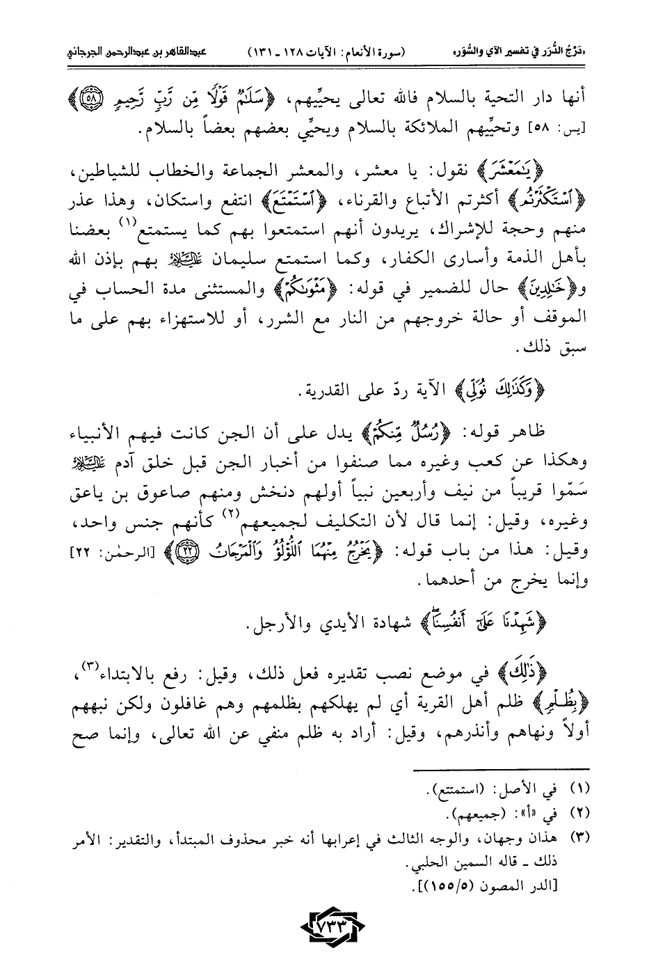 {يَا مَعْشَرَ} نقول: يا معشر، والمعشر الجماعة والخطاب للشياطين، {اسْتَكْثَرْتُمْ} أكثرتم الأتباع والقرناء، {اسْتَمْتَعَ} انتفع واستكان، وهذا عذر منهم وحجة للإشراك، يريدون أنهم استمتعوا بهم كما يستمتع (¬1) بعضنا بأهل الذمة وأسارى الكفار، وكما استمتع سليمان -عليه السلام- بهم بإذن الله و {خَالِدِينَ} حال للضمير في قوله: {مَثْوَاكُمْ} والمستثنى مدة الحساب في الموقف أو حالة خروجهم من النار مع الشرر، أو للاستهزاء بهم على ما سبق ذلك.