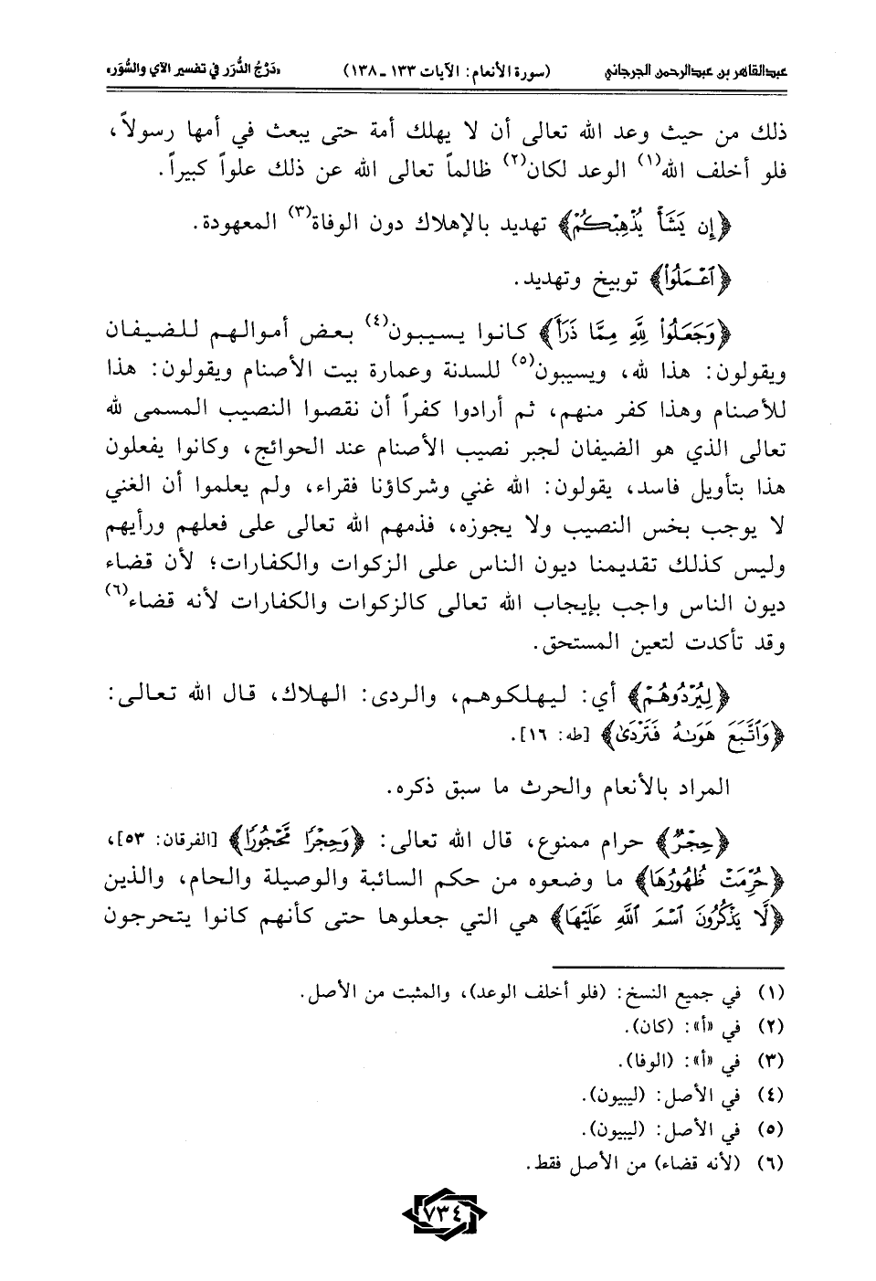 {وَجَعَلُوا لِلَّهِ مِمَّا ذَرَأَ} كانوا يسيبون (¬4) بعض أموالهم للضيفان ويقولون: هذا لله، ويسيبون (¬5) للسدنة وعمارة بيت الأصنام ويقولون: هذا للأصنام وهذا كفر منهم، ثم أرادوا كفرًا أن نقصوا النصيب المسمى لله تعالى الذي هو الضيفان لجبر نصيب الأصنام عند الحوائج، وكانوا يفعلون هذا بتأويل فاسد، يقولون: الله غني وشركاؤنا فقراء، ولم يعلموا أن الغني لا يوجب بخس النصيب ولا يجوزه، فذمهم الله تعالى على فعلهم ورأيهم وليس كذلك تقديمنا ديون الناس على الزكوات والكفارات؛ لأن قضاء ديون الناس واجب بإيجاب الله تعالى كالزكوات والكفارات لأنه قضاء (¬6) وقد تأكدت لتعين المستحق.