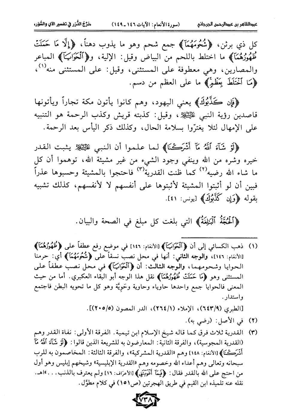(¬3) القدرية ثلاث فرق كما قاله شيخ الإسلام ابن تيمية. الفرقة الأولى: نفاة القدر وهم (القدرية المجوسية)، والفرقة الثانية: المعارضون به للشريعة الذين قالوا: {لَوْ شَاءَ اللَّهُ مَا أَشْرَكْنَا} [الأنعَام: 148] وهم "القدرية المشركية"، والفرقة الثالثة: المخاصمون به للرب سبحانه وتعالى وهم أعداء الله وخصومه وهم "القدرية الإبليسية" وشيخهم إبليس وهو أول من احتج على الله بالقدر فقال: {فَبِمَا أَغْوَيْتَنِي} الأعرَاف: 16] ولم يعترف بالذنب ... " اهـ. نقله عنه تلميذه ابن القيم في طريق الهجرتين (ص151) في كلام مطوَّل.