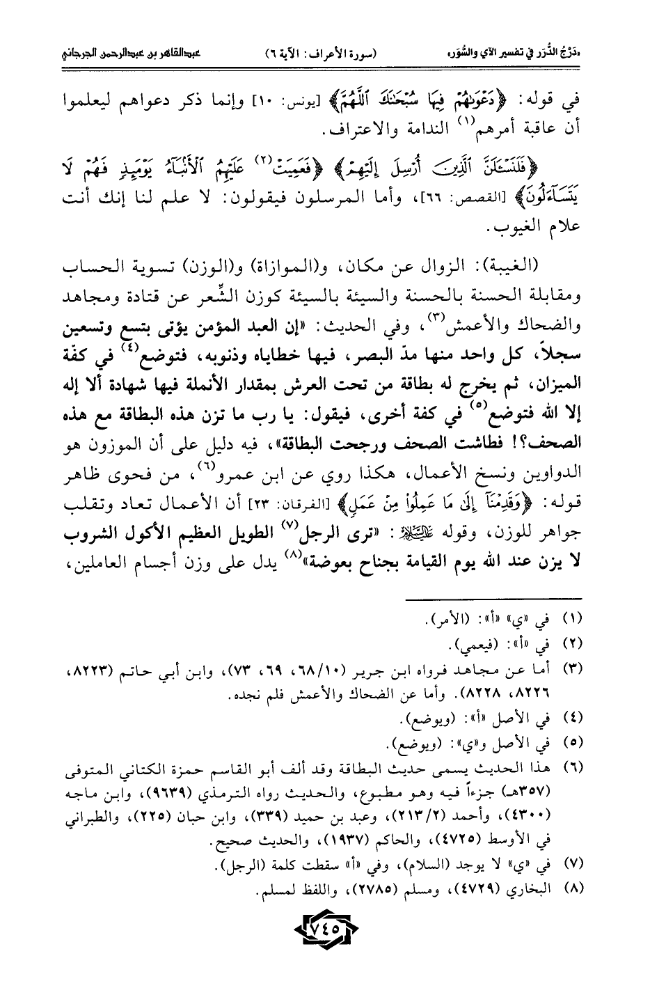 (¬6) هذا الحديث يسمى حديث البطاقة وقد ألف أبو القاسم حمزة الكتاني المتوفى (357 هـ) جزءًا فيه وهو مطبوع، والحديث رواه الترمذي (9639)، وابن ماجه (4300)، وأحمد (2/ 213)، وعبد بن حميد (339)، وابن حبان (225)، والطبراني في الأوسط (4725)، والحاكم (1937)، والحديث صحيح.