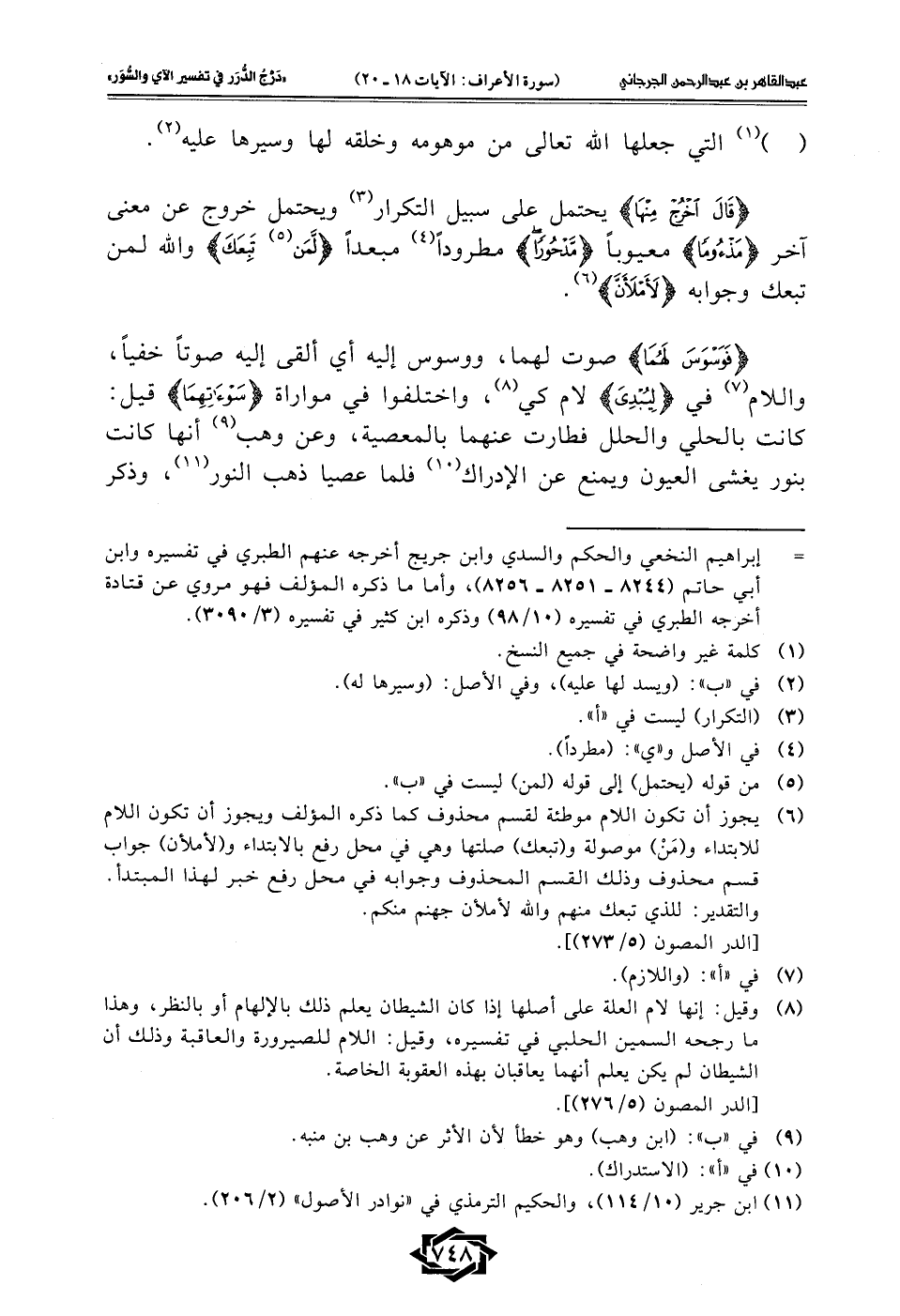 {قَالَ اخْرُجْ مِنْهَا} يحتمل على سبيل التكرار (¬3) ويحتمل خروج عن معنى آخر {مَذْءُومًا} معيوبًا {مَدْحُورًا} مطرودًا (¬4) مبعدًا {لَمَنْ (¬5) تَبِعَكَ} والله لمن تبعك وجوابه {لَأَمْلَأَنَّ} (¬6).