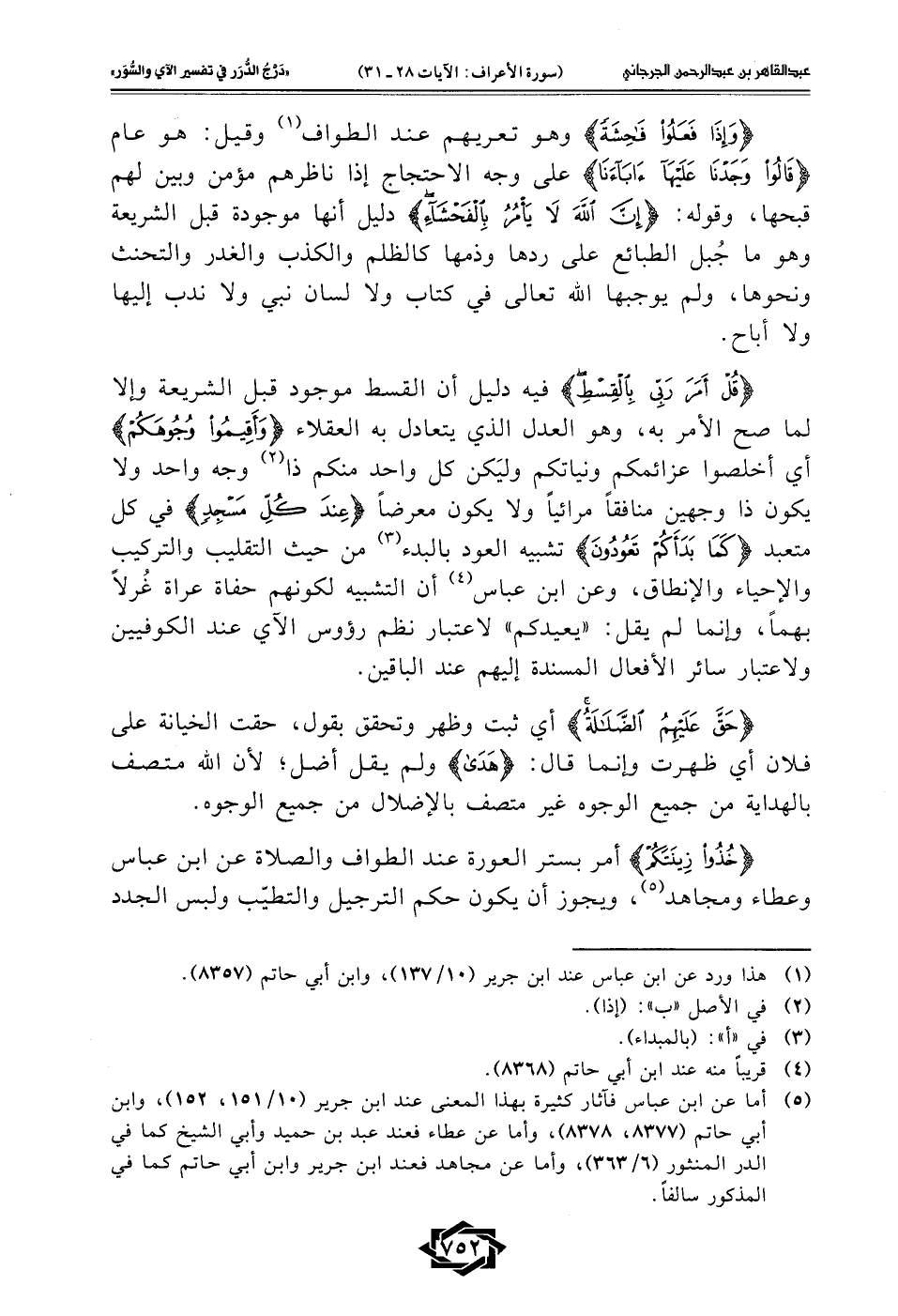 {قُلْ أَمَرَ رَبِّي بِالْقِسْطِ} فيه دليل أن القسط موجود قبل الشريعة وإلا لما صح الأمر به، وهو العدلى الذي يتعادلى به العقلاء {وَأَقِيمُوا وُجُوهَكُمْ} أي أخلصوا عزائمكم ونياتكم وليَكن كل واحد منكم ذا (¬2) وجه واحد ولا يكون ذا وجهين منافقًا مرائيًا ولا يكون معرضًا {عِنْدَ كُلِّ مَسْجِدٍ} في كل متعبد {كَمَا بَدَأَكُمْ تَعُودُونَ} تشبيه العود بالبدء (¬3) من حيث التقليب والتركيب والإحياء والإنطاق، وعن ابن عباس (¬4) أن التشبيه لكونهم حفاة عراة غُرلًا بهمًا، وإنما لم يقل: "يعيدكم" لاعتبار نظم رؤوس الآي عند الكوفيين ولاعتبار سائر الأفعال المسندة إليهم عند الباقين.
