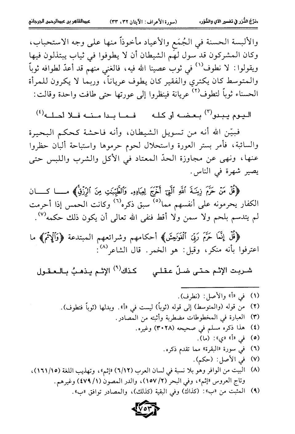 فبيّن الله أنه من تسويل الشيطان، وأنه فاحشة كحكم البحيرة والسائبة، فأمر بستر العورة واستحلال لحوم حرموها واستباحة ألبان حظروا عنها، ونهى عن مجاوزة الحدّ المعتاد في الأكل والشرب واللبس حتى يصير شهرة في الناس.