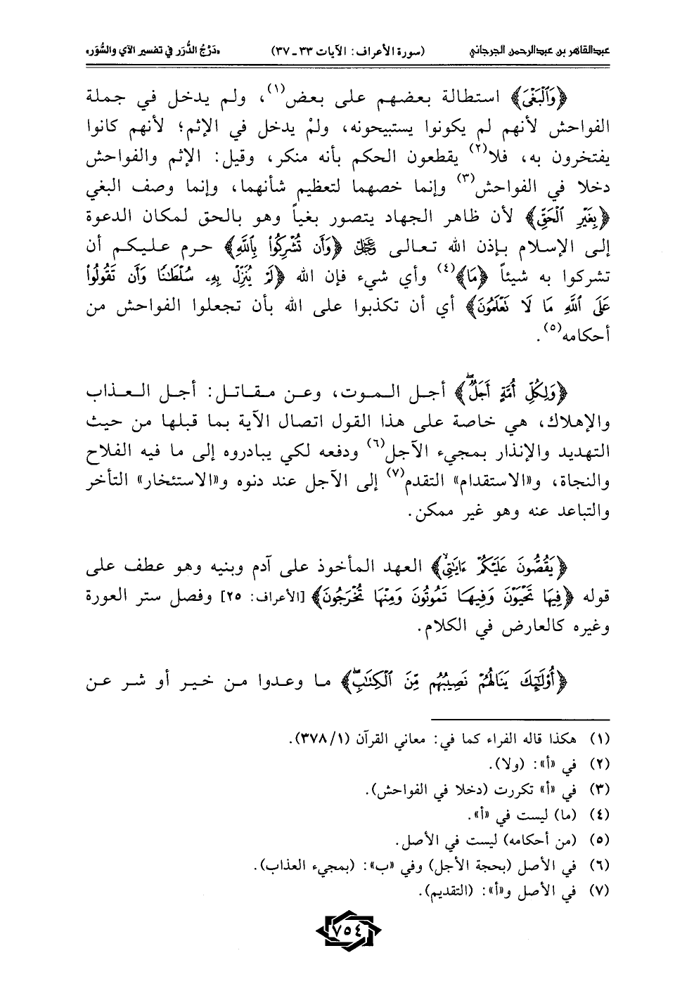 يستبيحونه، ولمْ يدخل في الإثم؛ لأنهم كانوا يفتخرون به، فلا (¬2) يقطعون الحكم بأنه منكر، وقيل: الإثم والفواحش دخلا في الفواحش (¬3) وإنما خصهما لتعظيم شأنهما، وإنما وصف البغي {بِغَيْرِ الْحَقِّ} لأن ظاهر الجهاد يتصور بغيًا وهو بالحق لمكان الدعوة إلى الإسلام بإذن الله تعالى -عَزَّ وَجَلَّ- {وَأَنْ تُشْرِكُوا بِاللَّهِ} حرم عليكم أن تشركوا به شيئًا {مَا} (¬4) وأي شيء فإن الله {لَمْ يُنَزِّلْ بِهِ سُلْطَانًا وَأَنْ تَقُولُوا عَلَى اللَّهِ مَا لَا تَعْلَمُونَ} أي أن تكذبوا على الله بأن تجعلوا الفواحش من أحكامه (¬5).