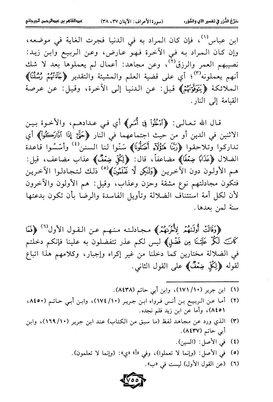 قال الله تعالى: {ادْخُلُوا فِي أُمَمٍ} أي في عدادهم، والأخوة بين الاثنين في الدين أو من حيث اجتماعهما في النار {حَتَّى إِذَا ادَّارَكُوا} أي تداركوا وتلاحقوا {رَبَّنَا هَؤُلَاءِ أَضَلُّونَا} سَنّوا لنا السنن (¬4) وأسّسُوا قاعدة الضلال {عَذَابًا ضِعْفًا} مضاعفًا، قال: {لِكُلٍّ ضِعْفٌ} عذاب مضاعف، قيل: هم الأولون دون الآخرين {وَلَكِنْ لَا تَعْلَمُونَ} (¬5) ذلك لتجادلوا الآخرين فتكون مجادلتهم نوع مشقة وحزن وعذاب، وقيل: هم الأولون والآخرون لأن لكل أمة استئناف الضلالة وتأويل الفاسدة والرضا بأن تكون بدعتها سنة لمن بعدها.