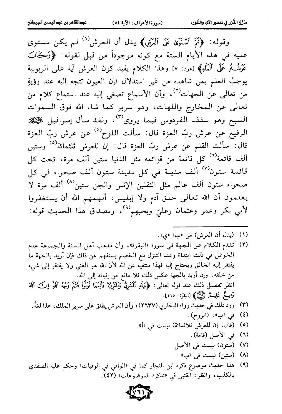 وقوله: {ثُمَّ اسْتَوَى عَلَى الْعَرْشِ} يدل أن العرش (¬1) لم يكن مستوى عليه في هذه الأيام الستة مع كونه موجودأ من قبل لقوله: {وَكَانَ عَرْشُهُ عَلَى الْمَاءِ} [هود: 7] وهذا الكلام يفيد كون العرش آية على الربوبية يوجبُ العلم بمن شاهده من غير استدلال فإن العيون تتجه إليه عند رؤيةِ من تعالى عن الجهات (¬2)، وأن الأسماع تصغي إليه عند استماع كلام من تعالى عن المخارج واللهات، وهو سرير كما شاء الله فوق السموات السبع وهو سقف الفردوس فيما يروى (¬3)، ولقد سأل إسرافيل -عليه السلام- الرفيع عن عرش ربّ العزة قال: سألت اللوح (¬4) عن عرش ربّ العزة قال: سألت القلم عن عرش ربّ العزة قال: إن للعرش ثلثمائة (¬5) وستين ألف قائمة (¬6) كل قائمة من قوائمه مثل الدنيا ستين ألف مرة، تحت كل قائمة ستون (¬7) ألف مدينة في كل مدينة ستون ألف صحراء في كل صحراء ستون ألف عالم مثل الثقلين الإنس والجن ستين (¬8) ألف مرة لا يعلمون أن الله تعالى خلق آدم ولا إبليس، ألهمهم الله أن يستغفروا لأبي بكر وعمر وعثمان وعليّ ويحبهم (¬9)، ومصداق هذا الحديث قوله: