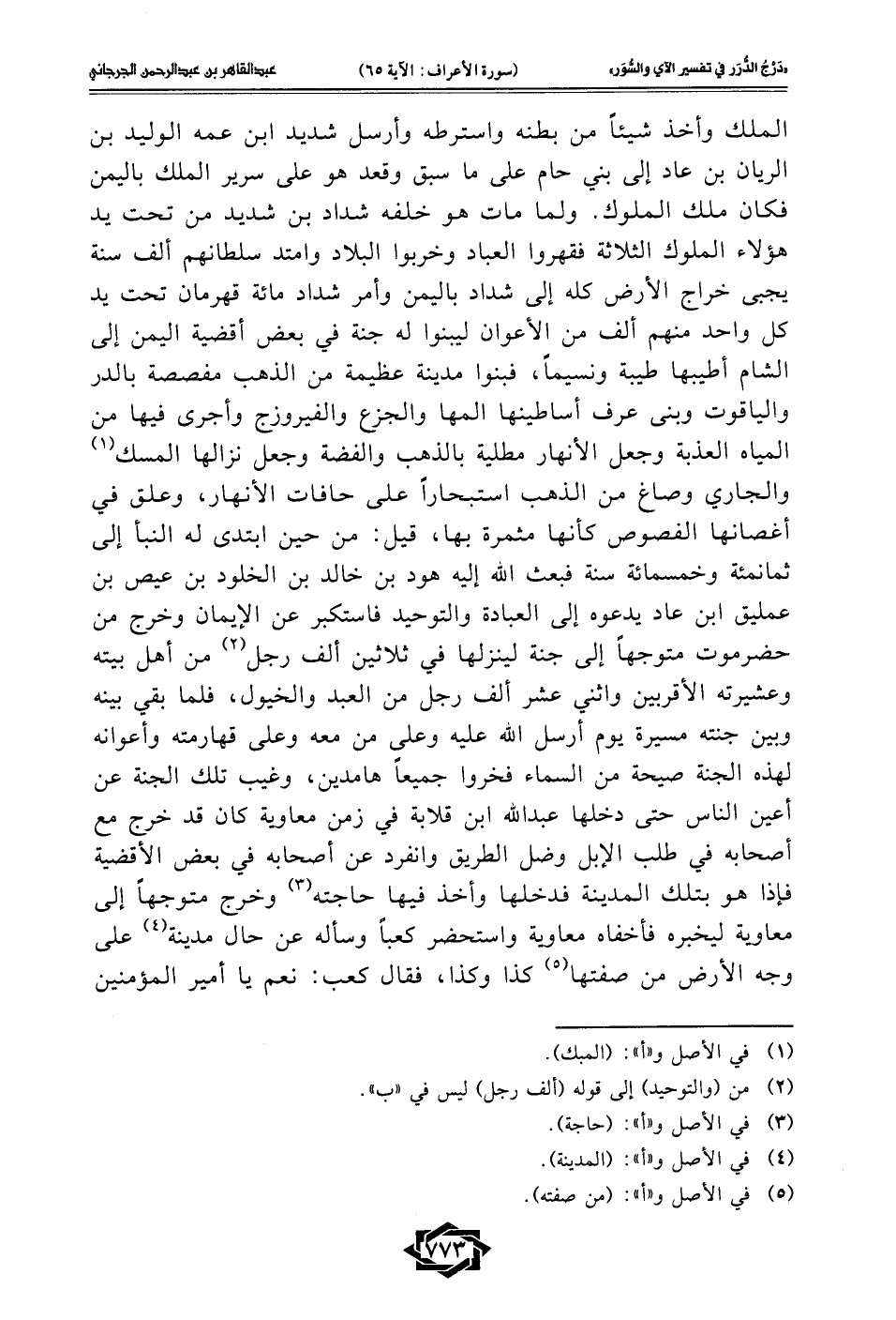 الملك وأخذ شيئًا من بطنه واسترطه وأرسل شديد ابن عمه الوليد بن الريان بن عاد إلى بني حام على ما سبق وقعد هو على سرير الملك باليمن فكان ملك الملوك. ولما مات هو خلفه شداد بن شديد من تحت يد هؤلاء الملوك الثلاثة فقهروا العباد وخربوا البلاد وامتد سلطانهم ألف سنة يجبى خراج الأرض كله إلى شداد باليمن وأمر شداد مائة قهرمان تحت يد كل واحد منهم ألف من الأعوان ليبنوا له جنة في بعض أقضية اليمن إلى الشام أطيبها طيبة ونسيمًا، فبنوا مدينة عظيمة من الذهب مفصصة بالدر والياقوت وبنى عرف أساطينها المها والجزع والفيروزج وأجرى فيها من المياه العذبة وجعل الأنهار مطلية بالذهب والفضة وجعل نزالها المسك (¬1) والجاري وصاغ من الذهب استبحارًا على حافات الأنهار، وعلق في أغصانها المنصوص كأنها مثمرة بها، قيل: من حين ابتدى له النبأ إلى ثمانمئة وخمسمائة سنة فبعث الله إليه هود بن خالد بن الخلود بن عيص بن عمليق ابن عاد يدعوه إلى العبادة والتوحيد فاستكبر عن الإيمان وخرج من حضرموت متوجهًا إلى جنة لينزلها في ثلاثين ألف رجل (¬2) من أهل بيته وعشيرته الأقربين واثني عشر ألف رجل من العبد والخيول، فلما بقي بينه وبين جنته مسيرة يوم أرسل الله عليه وعلى من معه وعلى قهارمته وأعوانه لهذه الجنة صيحة من السماء فخروا جميعًا هامدين، وغيب تلك الجنة عن أعين الناس حتى دخلها عبد الله ابن قلابة في زمن معاوية كان قد خرج مع أصحابه في طلب الإبل وضل الطريق وانفرد عن أصحابه في بعض الأقضية فإذا هو بتلك المدينة فدخلها وأخذ فيها حاجته (¬3) وخرج متوجهًا إلى معاوية ليخبره فأخفاه معاوية واستحضر كعبًا وسأله عن حال مدينة (¬4) على وجه الأرض من صفتها (¬5) كذا وكذا، فقال كعب: نعم يا أمير المؤمنين