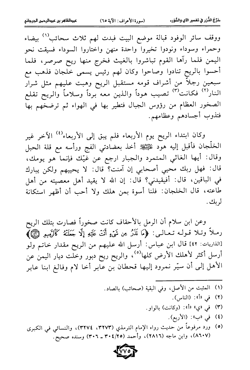 وعن ابن سلام أن الرمل بالأحقاف كانت صخورًا فصارت بتلك الريح رملأوتلا قوله تعالى: {مَا تَذَرُ مِنْ شَيْءٍ أَتَتْ عَلَيْهِ إِلَّا جَعَلَتْهُ كَالرَّمِيمِ (42)} [الذاريات: 42] قال ابن عباس: أرسل الله عليهم من الريح مقدار خاتم ولو أرسل أكثر لأهلك الأرض كلها (¬5)، والريح ريح دبور وخلت ديار اليمن عن الأهل إلى أن سيّر نمرود إليها قحطان بن عابر أخا لام وفالغ ابنا عابر