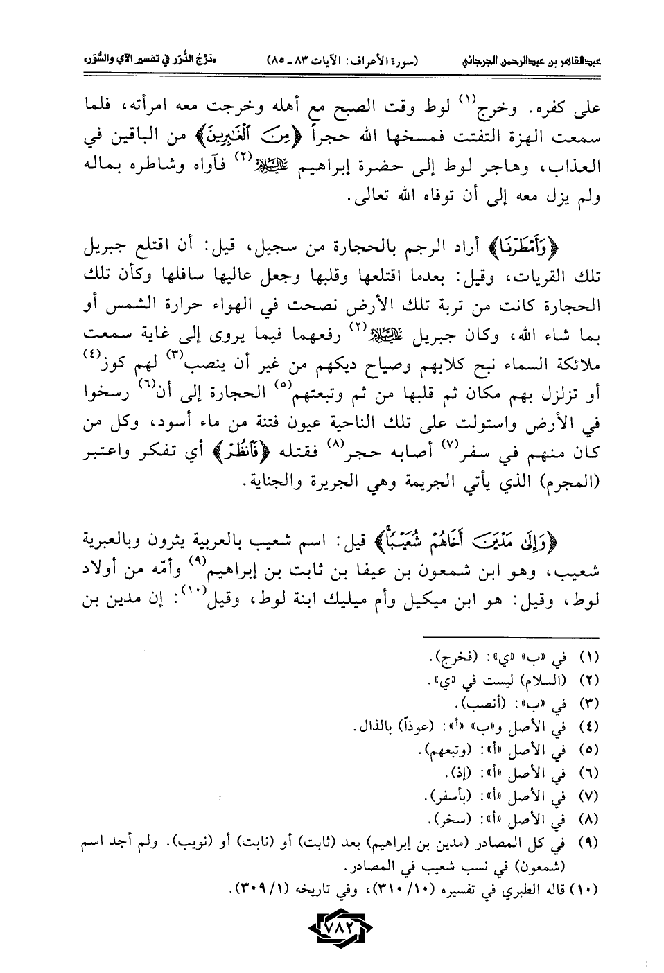 {وَأَمْطَرْنَا} أراد الرجم بالحجارة من سجيل، قيل: أن اقتلع جبريل تلك القريات، وقيل: بعد ما اقتلعها وقلبها وجعل عاليها سافلها وكأن تلك الحجارة كانت من تربة تلك الأرض نصحت في الهواء حرارة الشمس أو بما شاء الله، وكان جبريل -عليه السلام- (2) رفعهما فيما يروى إلى غاية سمعت ملائكة السماء نبح كلابهم وصياح ديكهم من غير أن ينصب (¬3) لهم كوز (¬4) أو تزلزل بهم مكان ثم قلبها من ثم وتبعتهم (¬5) الحجارة إلى أن (¬6) رسخوا في الأرض واستولت على تلك الناحية عيون فتنة من ماء أسود، وكل من كان منهم في سفر (¬7) أصابه حجر (¬8) فقتله {فَانْظُرْ} أي تفكر واعتبر (المجرم) الذي يأتي الجريمة وهي الجريرة والجناية.