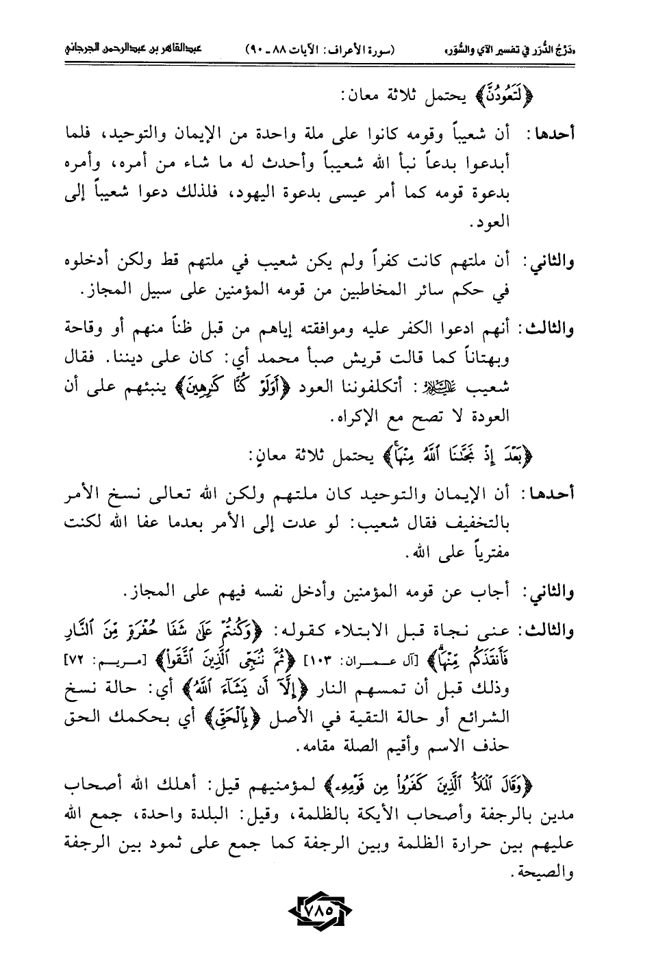 والثالث: أنهم ادعوا الكفر عليه وموافقته إياهم من قبل ظنًا منهم أو وقاحة وبهتانًا كما قالت قريش صبأ محمد أي: كان على ديننا. فقال شعيب -عليه السلام-: أتكلفوننا العود {أَوَلَوْ كُنَّا كَارِهِينَ} ينبئهم على أن العودة لا تصح مع الإكراه.
