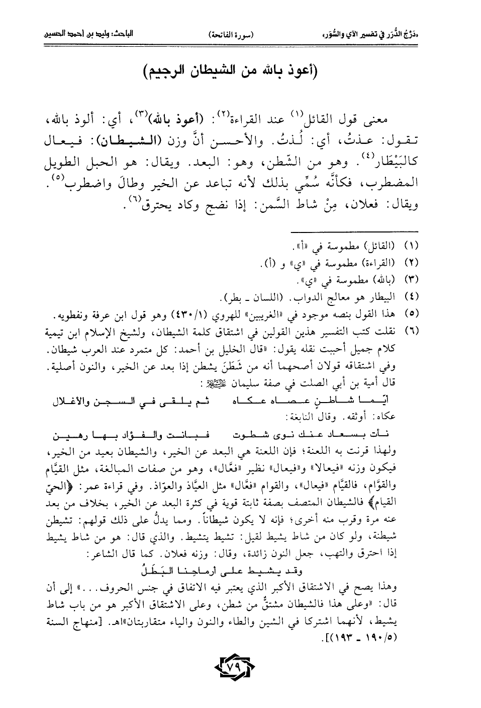 (¬6) نقلت كتب التفسير هذين القولين في اشتقاق كلمة الشيطان، ولشيخ الإسلام ابن تيمية كلام جميل أحببت نقله يقول: "قال الخليل بن أحمد: كل متمرد عند العرب شيطان. وفي اشتقاقه قولان أصحهما أنه من شَطَنَ يشطن إذا بعد عن الخير، والنون أصلية. قال أمية بن أبي الصلت في صفة سليمان -عليه السلام -: