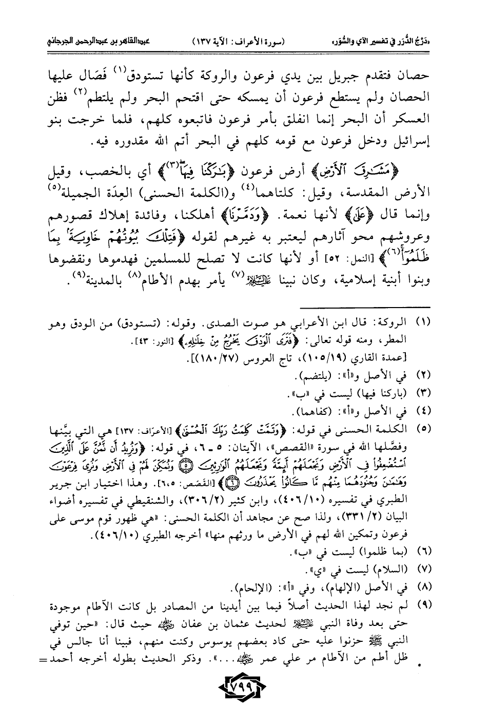 (¬5) الكلمة الحسنى في قوله: {وَتَمَّتْ كَلِمَتُ رَبِّكَ الْحُسْنَى} [الأعراف: 137] هي التي بيَّنها وفصَّلها الله في سورة "القصص"، الآيتان: 5 - 6، في قوله: {وَنُرِيدُ أَنْ نَمُنَّ عَلَى الَّذِينَ اسْتُضْعِفُوا فِي الْأَرْضِ وَنَجْعَلَهُمْ أَئِمَّةً وَنَجْعَلَهُمُ الْوَارِثِينَ (5) وَنُمَكِّنَ لَهُمْ فِي الْأَرْضِ وَنُرِيَ فِرْعَوْنَ وَهَامَانَ وَجُنُودَهُمَا مِنْهُمْ مَا كَانُوا يَحْذَرُونَ (6)} [القصص: 5، 6]. وهذا اختيار ابن جرير الطبري في تفسيره (10/ 406)، وابن كثير (2/ 306)، والشنقيطي في تفسيره أضواء البيان (2/ 331)، ولذا صح عن مجاهد أن الكلمة الحسنى: "هي ظهور قوم موسى على فرعون وتمكين الله لهم في الأرض ما ورثهم منها" أخرجه الطبري (10/ 406).