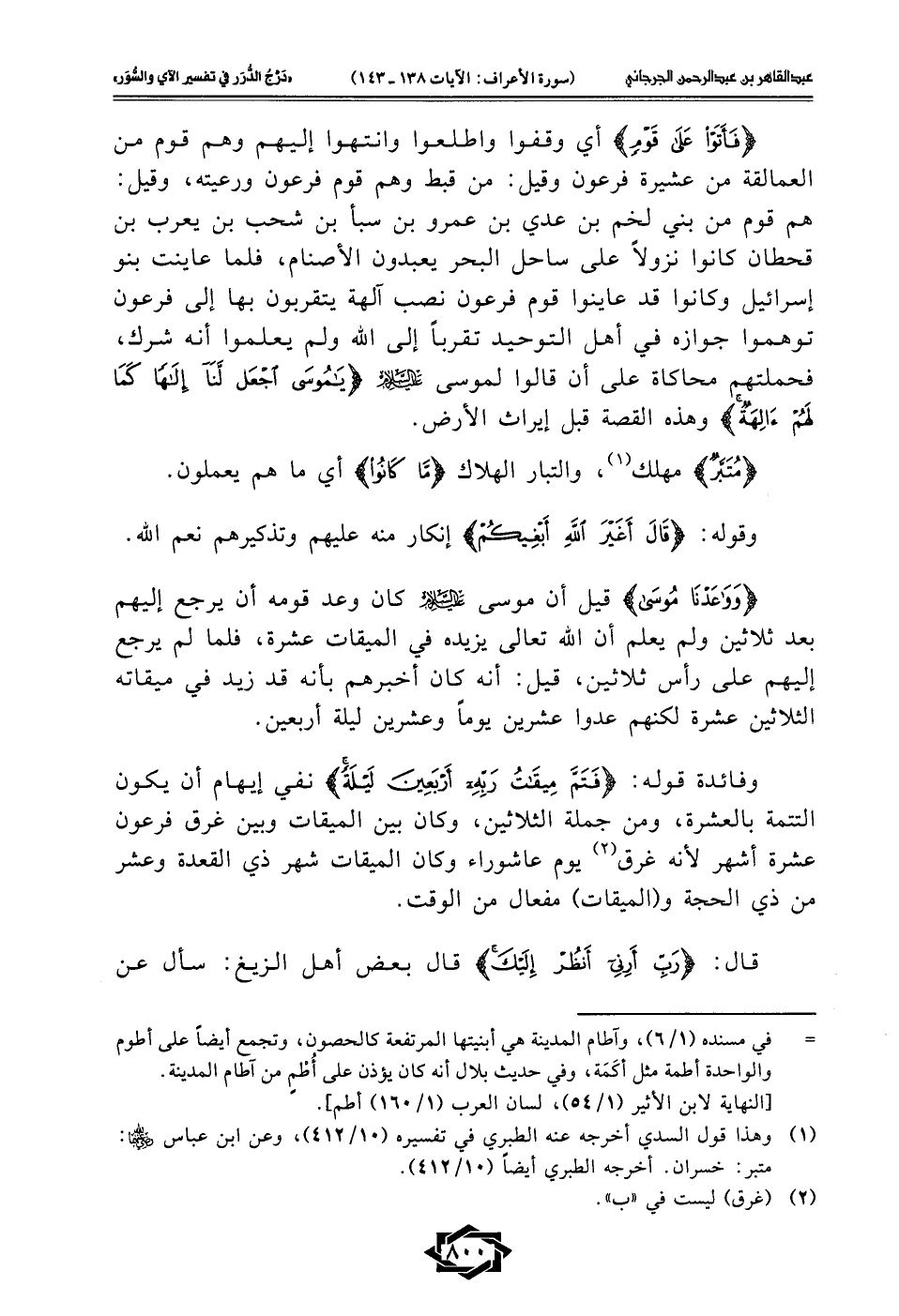 {فَأَتَوْا عَلَى قَوْمٍ} أي وقفوا واطلعوا وانتهوا إليهم وهم قوم من العمالقة من عشيرة فرعون وقيل: من قبط وهم قوم فرعون ورعيته، وقيل: هم قوم من بني لخم بن عدي بن عمرو بن سبأ بن شحب بن يعرب بن قحطان كانوا نزولًا على ساحل البحر يعبدون الأصنام، فلما عاينت بنو إسرائيل وكانوا قد عاينوا قوم فرعون نصب آلهة يتقربون بها إلى فرعون توهموا جوازه في أهل التوحيد تقربًا إلى الله ولم يعلموا أنه شرك، فحملتهم محاكاة على أن قالوا لموسى -عليه السلام- {يَا مُوسَى اجْعَلْ لَنَا إِلَهًا كَمَا لَهُمْ آلِهَةٌ} وهذه القصة قبل إيراث الأرض.