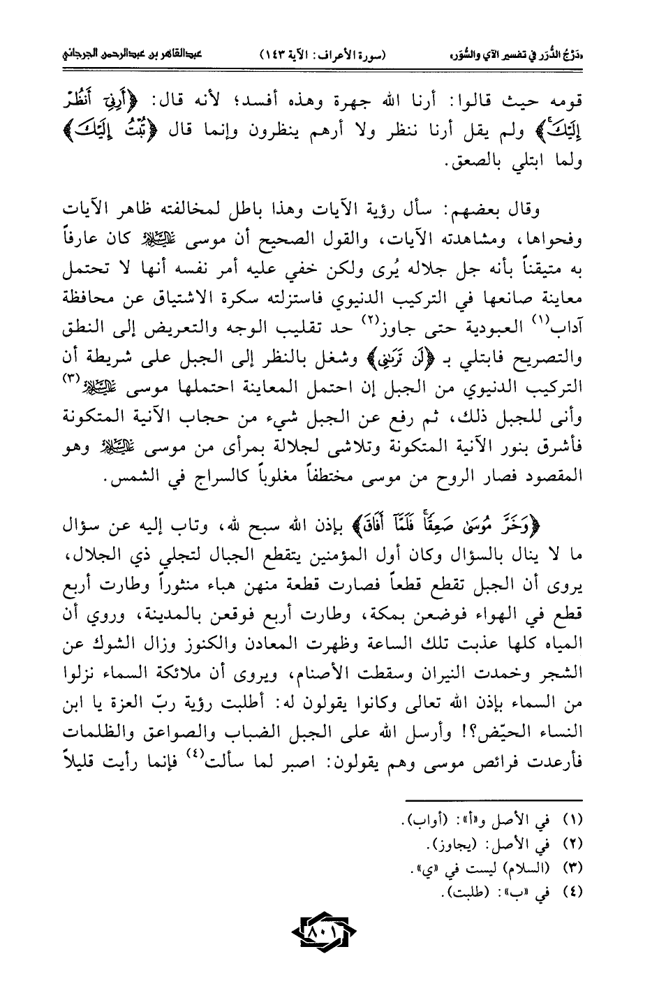 وقال بعضهم: سأل رؤية الآيات وهذا باطل لمخالفته ظاهر الآيات وفحواها، ومشاهدته الآيات، والقول الصحيح أن موسى -عليه السلام- كان عارفًا به متيقنًا بأنه جل جلاله يُرى ولكن خفي عليه أمر نفسه أنها لا تحتمل معاينة صانعها في التركيب الدنيوي فاستزلته سكرة الاشتياق عن محافظة آداب (¬1) العبودية حتى جاوز (¬2) حد تقليب الوجه والتعريض إلى النطق والتصريح فابتلي بـ {لَنْ تَرَانِي} وشغل بالنظر إلى الجبل على شريطة أن التركيب الدنيوي من الجبل إن احتمل المعاينة احتملها موسى -عليه السلام- (¬3) وأنى للجبل ذلك، ثم رفع عن الجبل شيء من حجاب الآنية المتكونة فأشرق بنور الآنية المتكونة وتلاشى لجلالة بمرأى من موسى -عليه السلام- وهو المقصود فصار الروح من موسى مختطفًا مغلوبًا كالسراج في الشمس.