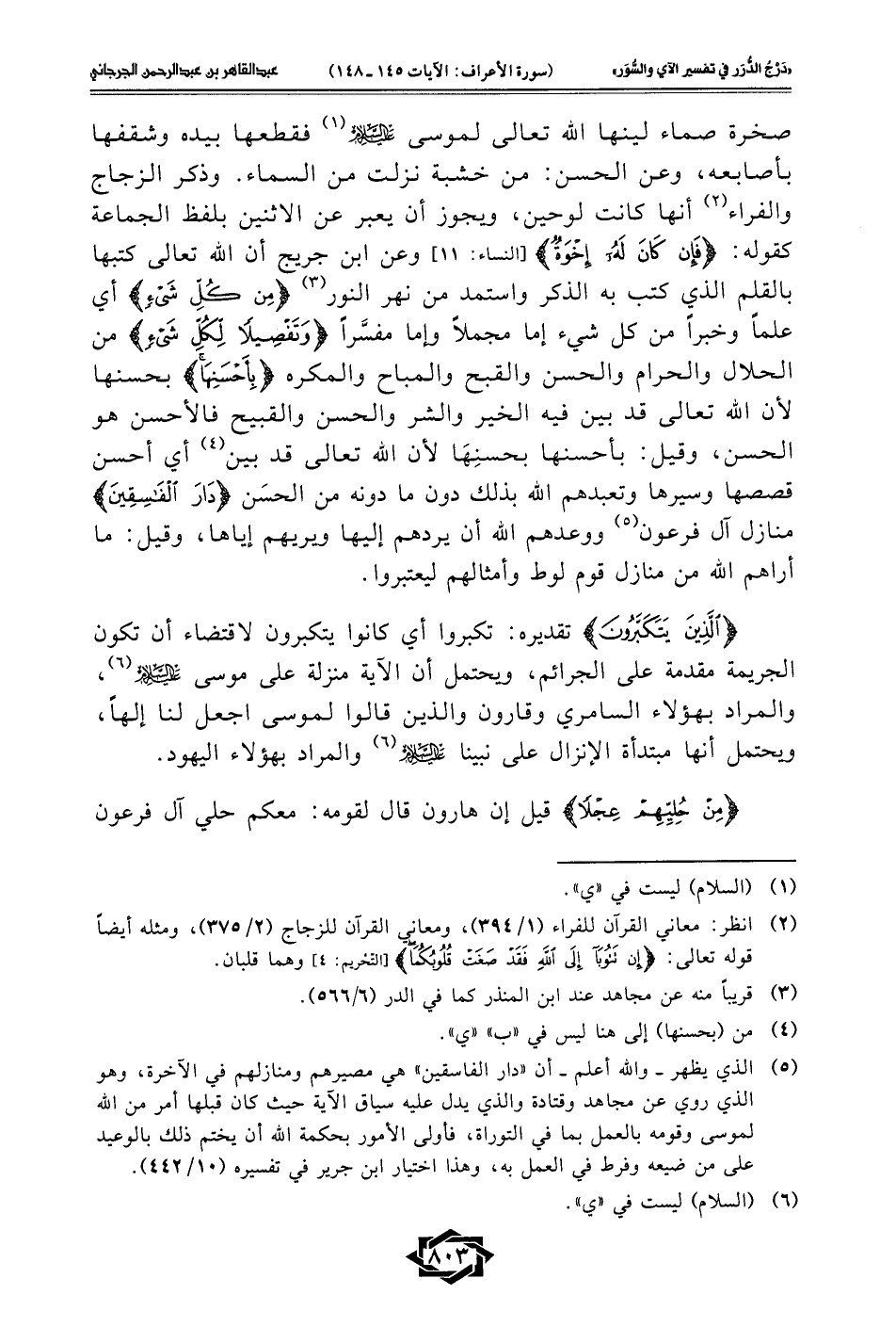 صخرة صماء لينها الله تعالى لموسى -عليه السلام- (¬1) فقطعها بيده وشقفها بأصابعه، وعن الحسن: من خشبة نزلت من السماء. وذكر الزجاج والفراء (¬2) أنها كانت لوحين، ويجوز أن يعبر عن الاثنين بلفظ الجماعة كقوله: {فَإِنْ كَانَ لَهُ إِخْوَةٌ} [النساء: 11] وعن ابن جريج أن الله تعالى كتبها بالقلم الذي كتب به الذكر واستمد من نهر النور (¬3) {مِنْ كُلِّ شَيْءٍ} أي علمًا وخبرًا من كل شيء إما مجملًا وإما مفسَّرًا {وَتَفْصِيلًا لِكُلِّ شَيْءٍ} من الحلال والحرام والحسن والقبح والمباح والمكره {بِأَحْسَنِهَا} بحسنها لأن الله تعالى قد بين فيه الخير والشر والحسن والقبيح فالأحسن هو الحسن، وقيل: بأحسنها بحسنِهَا لأن الله تعالى قد بين (¬4) أي أحسن قصصها وسيرها وتعبدهم الله بذلك دون ما دونه من الحسَن {دَارَ الْفَاسِقِينَ} منازل آل فرعون (¬5) ووعدهم الله أن يردهم إليها ويريهم إياها، وقيل: ما أراهم الله من منازل قوم لوط وأمثالهم ليعتبروا.