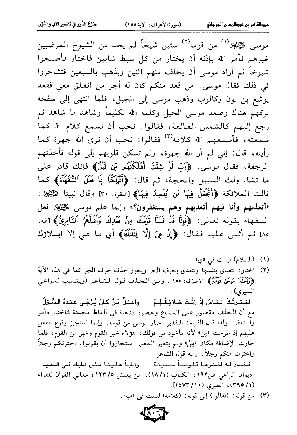 (¬2) اختار: تتعدى بنفسها وتتعدى بحرف الجر ويجوز حذف حرف الجر كما في هذه الآية {وَاخْتَارَ مُوسَى قَوْمَهُ} [الأعرَاف: 155]. ومن الحذف قول الشاعر (وينسب للراعي النميري):