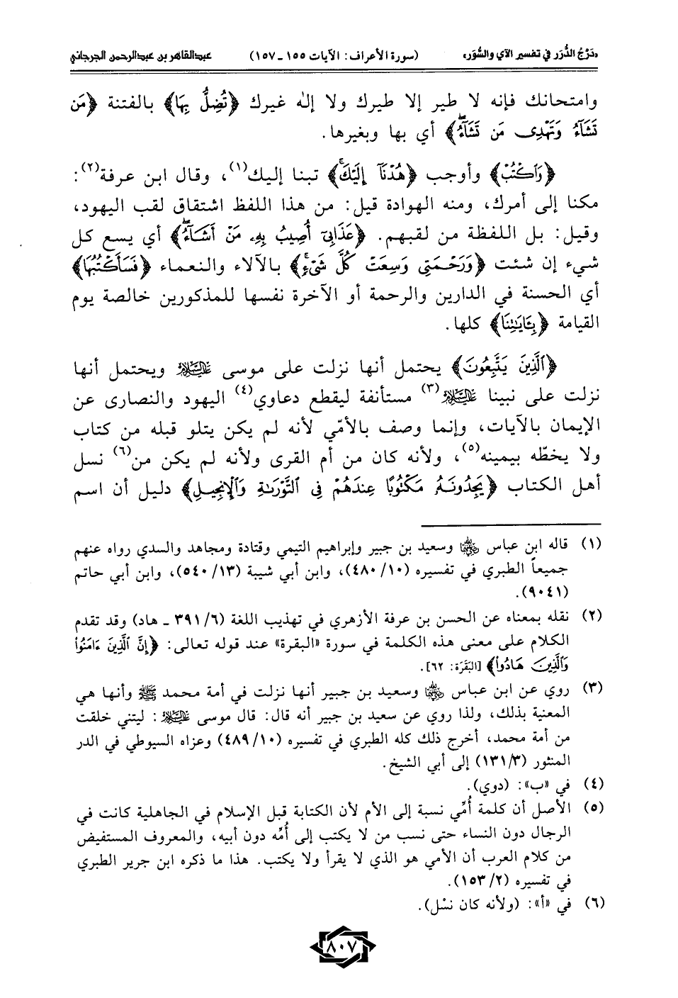 {وَاكْتُبْ} وأوجب {هُدْنَا إِلَيْكَ} تبنا إليك (¬1)، وقال ابن عرفة (¬2): مكنا إلى أمرك، ومنه الهوادة قيل: من هذا اللفظ اشتقاق لقب اليهود، وقيل: بل اللفظة من لقبهم. {عَذَابِي أُصِيبُ بِهِ مَنْ أَشَاءُ} أي يسع كل شيء إن شئت {وَرَحْمَتِي وَسِعَتْ كُلَّ شَيْءٍ} بالآلاء والنعماء {فَسَأَكْتُبُهَا} أي الحسنة في الدارين والرحمة أو الآخرة نفسها للمذكورين خالصة يوم القيامة {بِآيَاتِنَا} كلها.