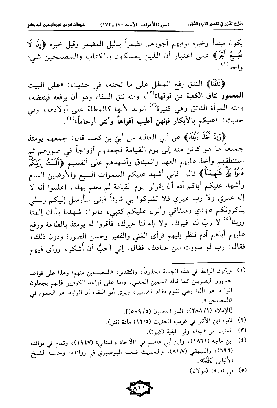 {وَإِذْ أَخَذَ رَبُّكَ} عن أبي العالية عن أبيّ بن كعب قال: جمعهم يومئذ جميعًا ما هو كائن منه إلى يوم القيامة فجعلهم أزواجًا في صورهم ثم استنطقهم وأخذ عليهم العهد والميثاق وأشهدهم على أنفسهم {أَلَسْتُ بِرَبِّكُمْ قَالُوا بَلَى شَهِدْنَا} قال: فإني أشهد عليكم السموات السبع والأرضين السبع وأشهد عليكم أباكم آدم أن يقولوا يوم القيامة لم نعلم بهذا، اعلموا أنه لا إله غيري ولا رب غيري فلا تشركوا بي شيئًا فإني سأرسل إليكم رسلي يذكرونكم عهدي وميثاقي وأنزل عليكم كتبي، قالوا: شهدنا بأنك إلهنا وربنا (¬5) لا ربّ لنا غيرك، ولا إله لنا غيرك، فأقروا له يومئذ بالطاعة ورفع عليهم أباهم آدم فنظر إليهم فرأى الغني والفقير وحسن الصورة ودون ذلك، فقال: رب لو سويت بين عبادك، فقال: إني أحِبُّ أن أُشكر، ورأى فيهم