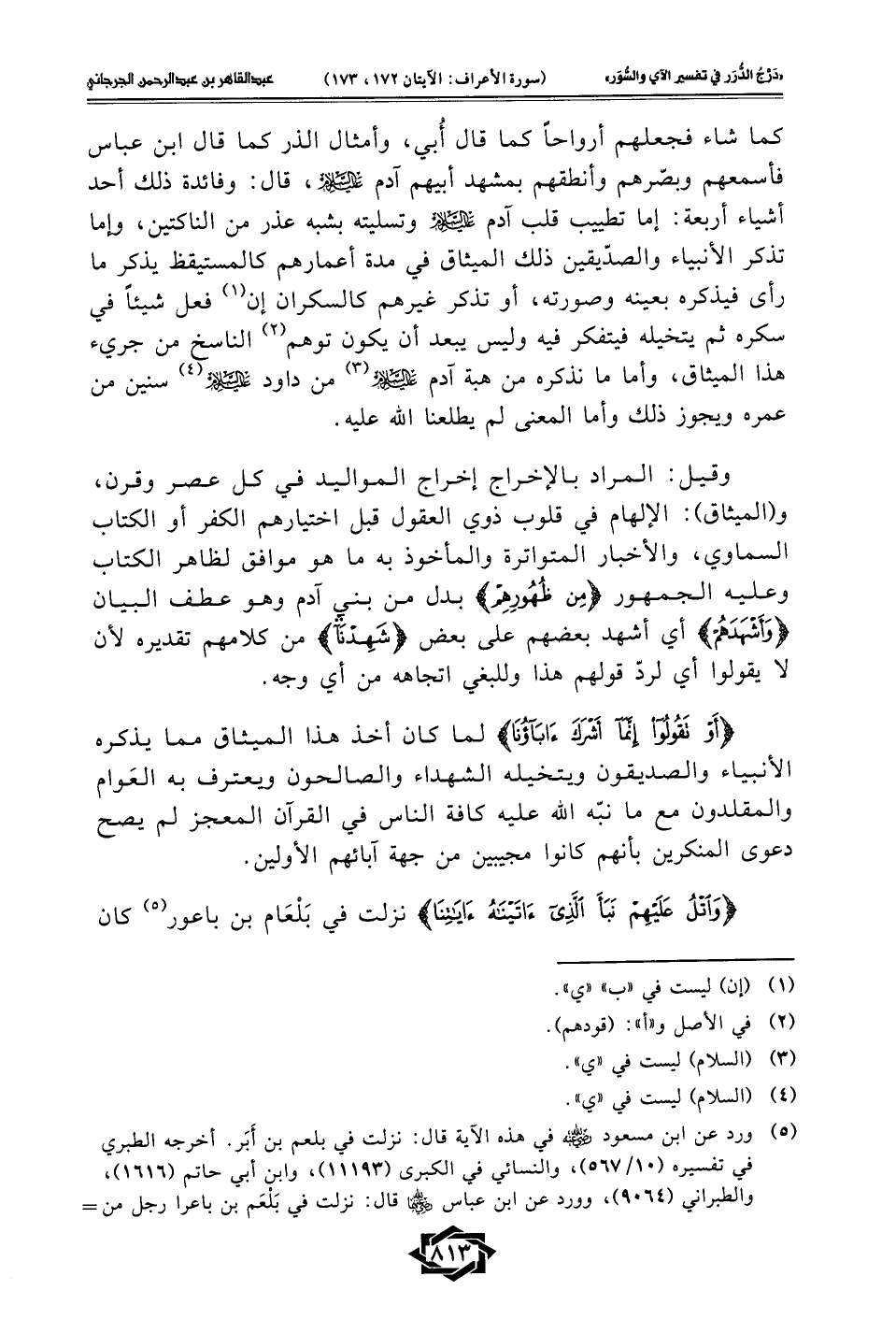 وقيل: المراد بالإخراج إخراج المواليد في كل عصر وقرن، و (الميثاق): الإلهام في قلوب ذوي العقول قبل اختيارهم الكفر أو الكتاب السماوي، والأخبار المتواترة والمأخوذ به ما هو موافق لظاهر الكتاب وعليه الجمهور {مِنْ ظُهُورِهِمْ} بدل من بني آدم وهو عطف البيان {وَأَشْهَدَهُمْ} أي أشهد بعضهم على بعض {شَهِدْنَا} من كلامهم تقديره لأن لا يقولوا أي لردّ قولهم هذا وللبغي اتجاهه من أي وجه.