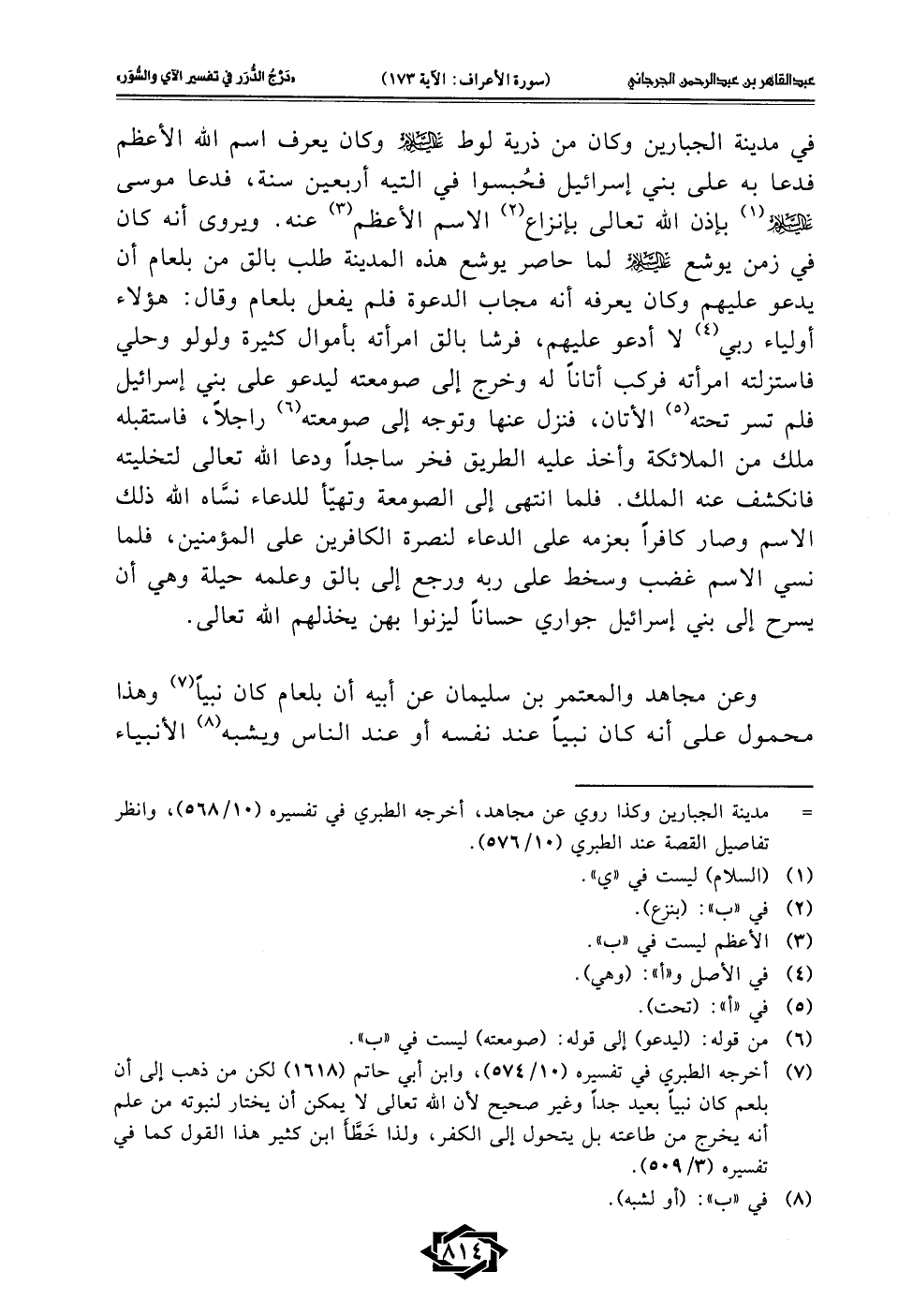 (¬7) أخرجه الطبري في تفسيره (10/ 574)، وابن أبي حاتم (1618) لكن من ذهب إلى أن بلعم كان نبيًا بعيد جدًا وغير صحيح لأن الله تعالى لا يمكن أن يختار لنبوته من علم أنه يخرج من طاعته بل يتحول إلى الكفر، ولذا خَطَّأَ ابن كثير هذا القول كما في تفسيره (3/ 509).