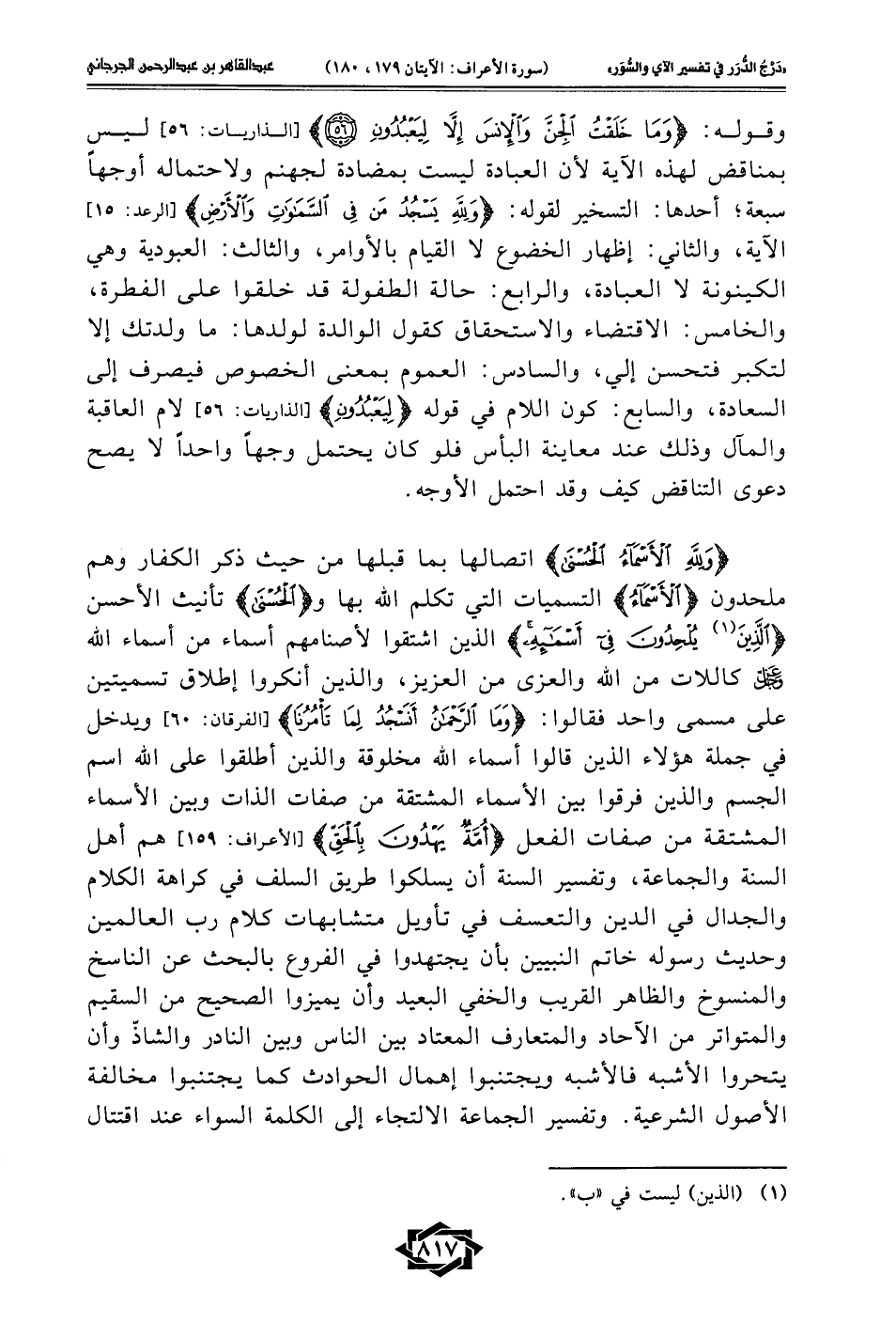 {وَلِلَّهِ الْأَسْمَاءُ الْحُسْنَى} اتصالها بما قبلها من حيث ذكر الكفار وهم ملحدون {الْأَسْمَاءُ} التسميات التي تكلم الله بها و {الْحُسْنَى} تأنيث الأحسن {الَّذِينَ (¬1) يُلْحِدُونَ فِي أَسْمَائِهِ} الذين اشتقوا لأصنامهم أسماء من أسماء الله -عَزَّ وَجَلَّ- كاللات من الله والعزى من العزيز، والذين أنكروا إطلاق تسميتين على مسمى واحد فقالوا: {وَمَا الرَّحْمَنُ أَنَسْجُدُ لِمَا تَأْمُرُنَا} [الفرقان: 60] ويدخل في جملة هؤلاء الذين قالوا أسماء الله مخلوقة والذين أطلقوا على الله اسم الجسم والذين فرقوا بين الأسماء المشتقة من صفات الذات وبين الأسماء المشتقة من صفات الفعل {أُمَّةٌ يَهْدُونَ بِالْحَقِّ} [الأعراف: 159] هم أهل السنة والجماعة، وتفسير السنة أن يسلكوا طريق السلف في كراهة الكلام والجدال في الدين والتعسف في تأويل متشابهات كلام رب العالمين وحديث رسوله خاتم النبيين بأن يجتهدوا في الفروع بالبحث عن الناسخ والمنسوخ والظاهر القريب والخفي البعيد وأن يميزوا الصحيح من السقيم والمتواتر من الآحاد والمتعارف المعتاد بين الناس وبين النادر والشاذّ وأن يتحروا الأشبه فالأشبه ويجتنبوا إهمال الحوادث كما يجتنبوا مخالفة الأصول الشرعية. وتفسير الجماعة الالتجاء إلى الكلمة السواء عند اقتتال