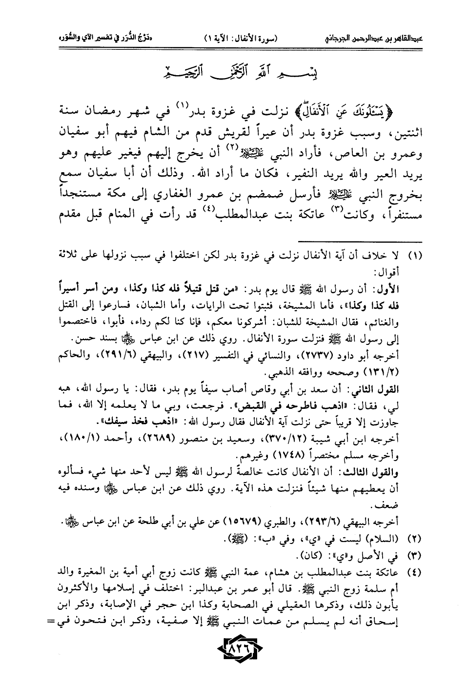 (¬1) لا خلاف أن آية الأنفال نزلت في غزوة بدر لكن اختلفوا في سبب نزولها على ثلاثة أقوال: