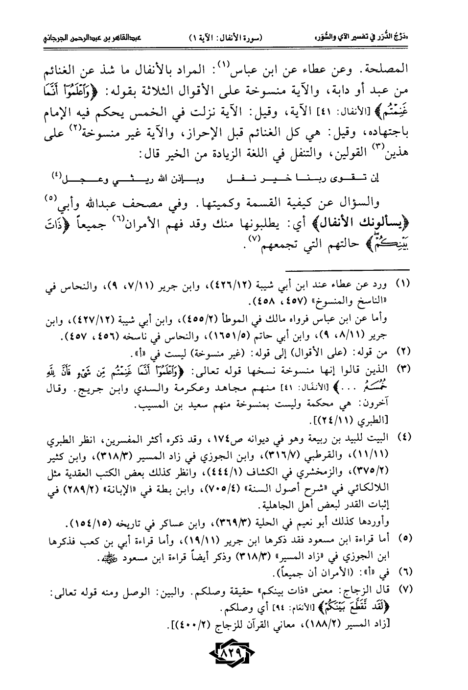 المصلحة. وعن عطاء عن ابن عباس (¬1): المراد بالأنفال ما شذ عن الغنائم من عبد أو دابة، والآية منسوخة على الأقوال الثلاثة بقوله: {وَاعْلَمُوا أَنَّمَا غَنِمْتُمْ} [الأنفال: 41] الآية، وقيل: الآية نزلت في الخمس يحكم فيه الإمام باجتهاده، وقيل: هي كل الغنائم قبل الإحراز، والآية غير منسوخة (¬2) على هذين (¬3) القولين، والتنفل في اللغة الزيادة من الخير قال: